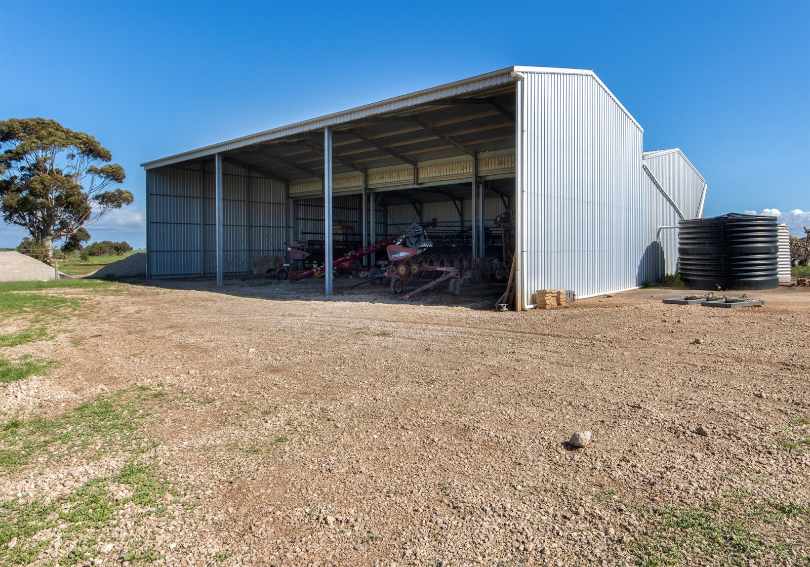 Implement shed (2 sections), rear of shed (24.3m x 7.3m x 4.8m*), front of shed (24.3m x 7.3m x 9.2m*), plus 2 x 22,500ltr poly rain water tanks