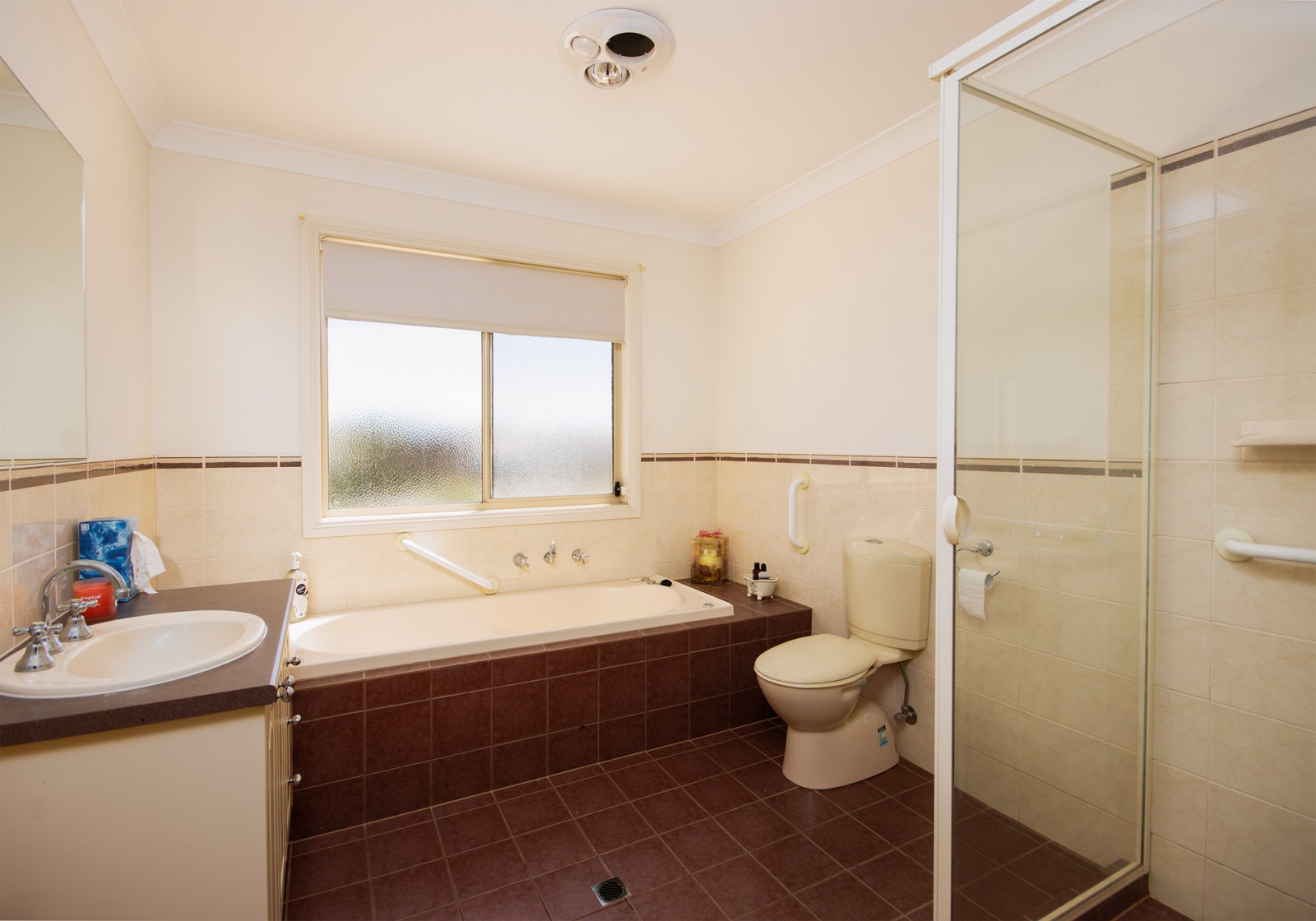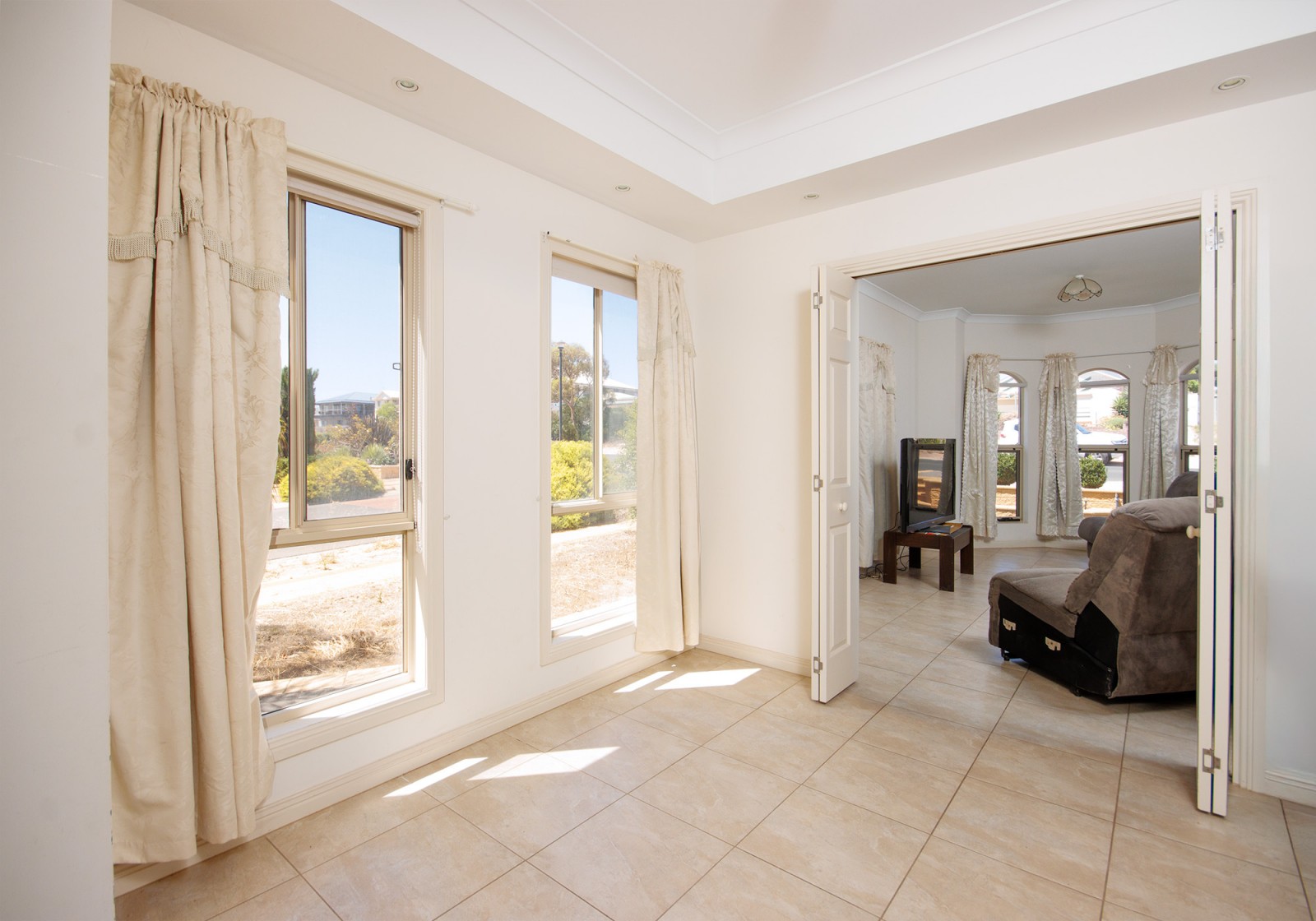 Upstairs, the home continues to impress. The luxurious master suite includes a bay window, walk-in robe & private ensuite with a shower & toilet. Bedrooms two & three are generously sized, complete with built-in robes & heat bars for added comfort. The upper level also boasts a spacious living area, fitted with a reverse-cycle split system & heat bar, perfect for relaxing with family. The main bathroom includes a spa bath, shower, toilet & vanity, offering a touch of indulgence. French doors lead out to a small balcony at the front of the home, where you can enjoy picturesque sea views & sunsets.