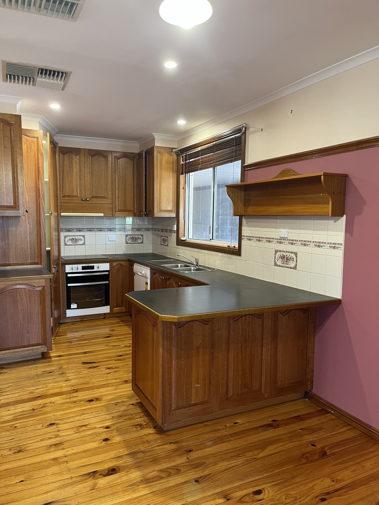 The home features three generously sized bedrooms, all centrally located around the main bathroom. A semi-open plan design connects the living, dining, and kitchen areas, enhanced by polished timber floors that add warmth and character. The well-appointed timber kitchen includes a flat-top cooktop, under-bench oven, and dishwasher—ideal for everyday use and entertaining alike.
