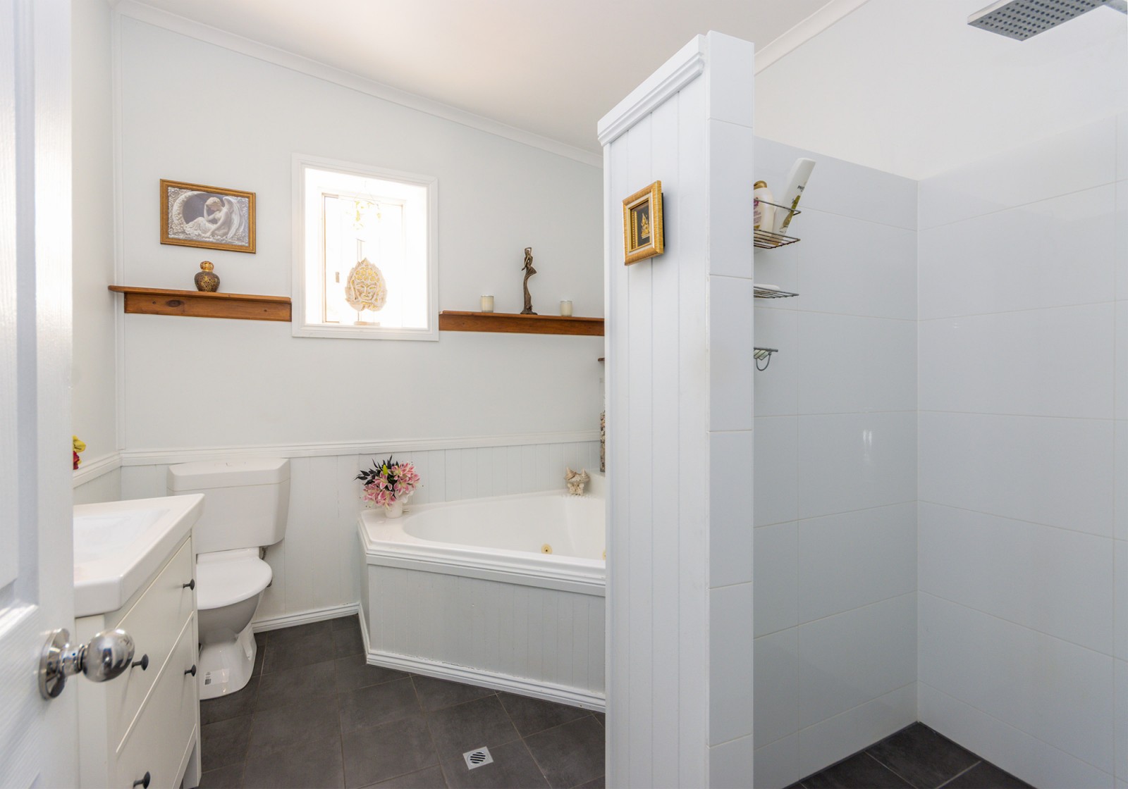 Both bathrooms have been thoughtfully renovated to combine luxury with functionality. The master ensuite features a sleek shower, toilet, & vanity, while the main bathroom indulges with a corner spa, shower, toilet & freestanding vanity. A hidden, oversized laundry ensures practicality is never compromised.