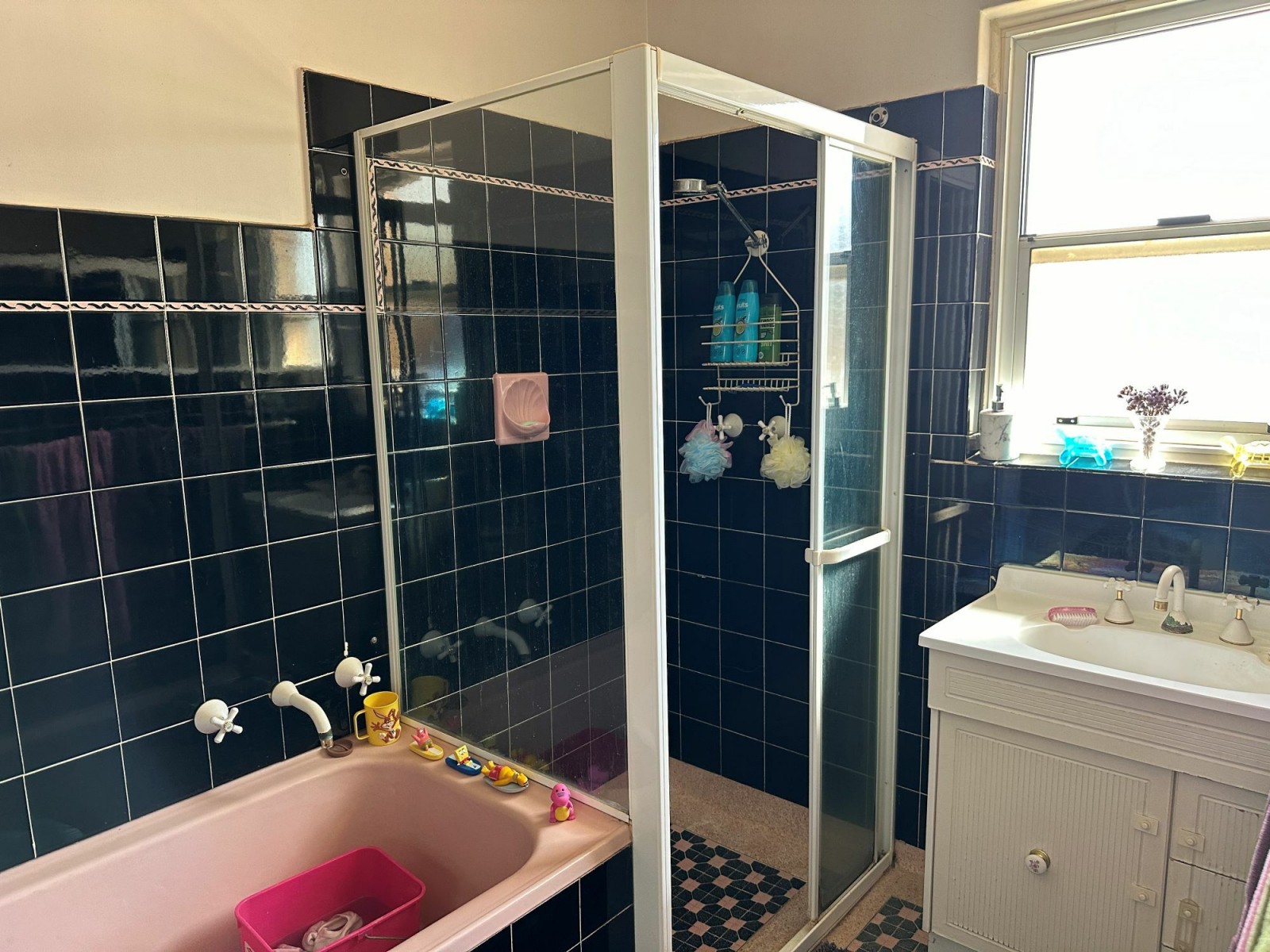 - Neat bathroom with tiled floor, bath, shower, and single vanity