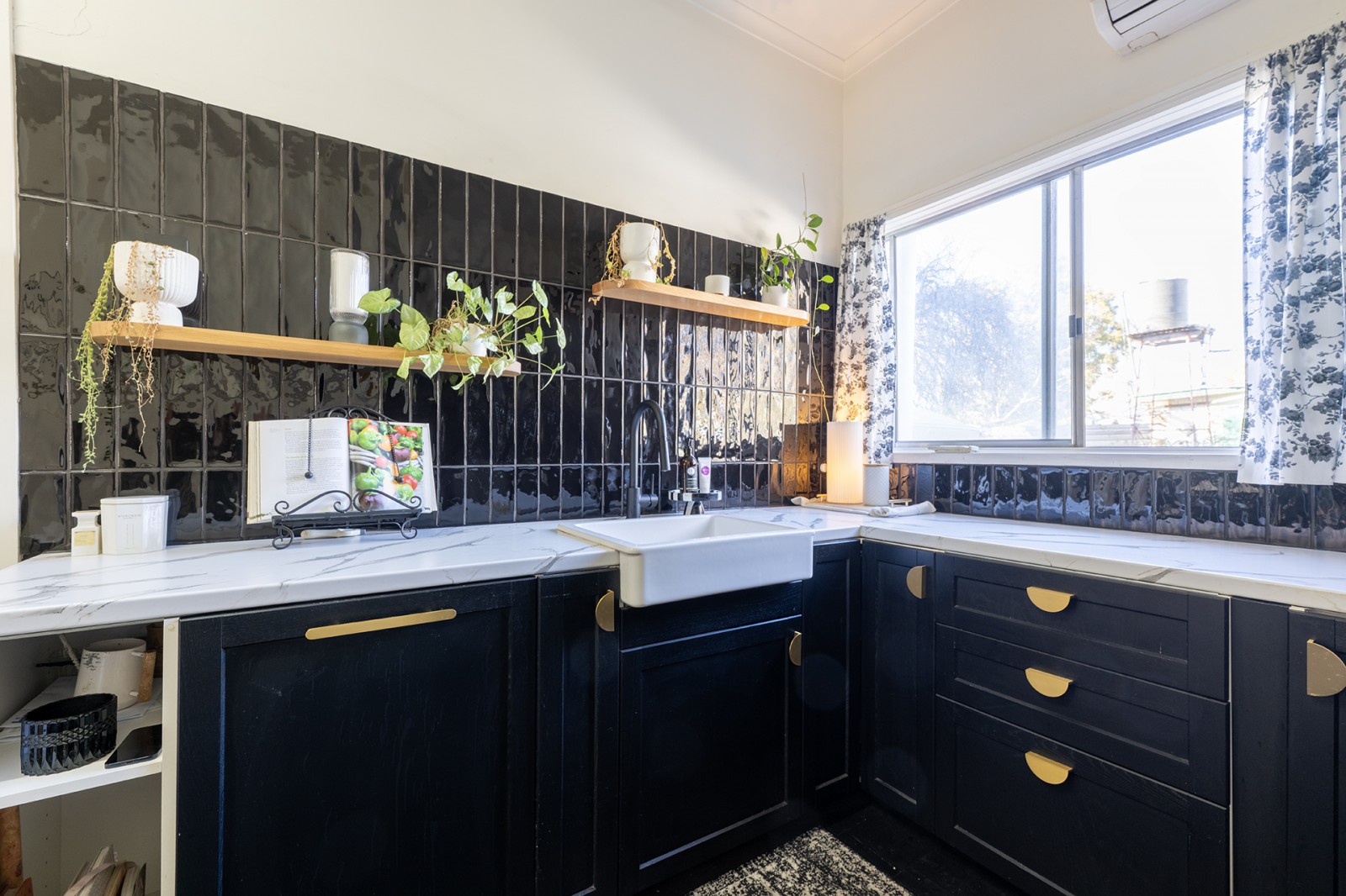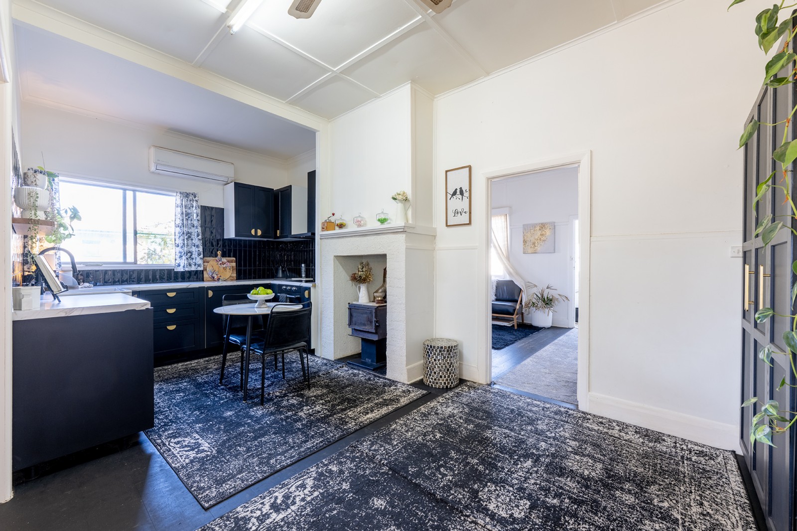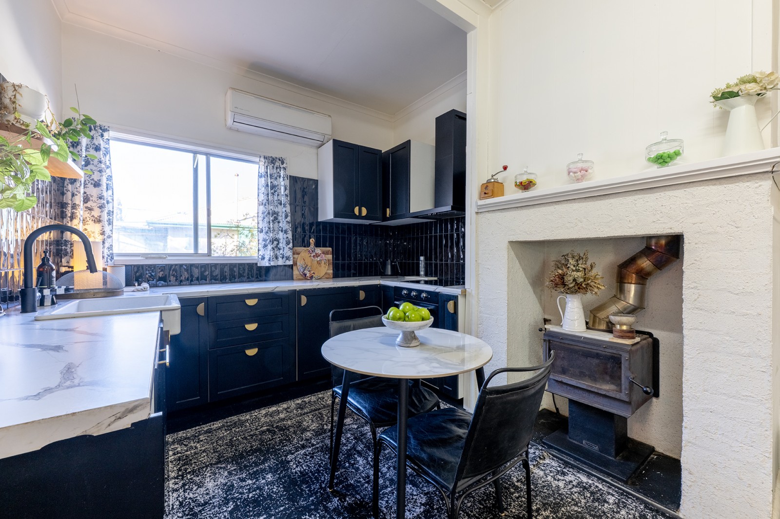 At the heart of the home lies a beautifully renovated kitchen—a statement of craftsmanship and timeless sophistication. Featuring custom handmade oak wood open shelving, custom hardwood cabinetry, soft-close drawers, brass hardware, a farmhouse sink, integrated dishwasher and bar fridge, electric stove top, range hood, and a Coonara woodfire heater that adds rustic warmth and ambiance—this space effortlessly blends functionality with charm.