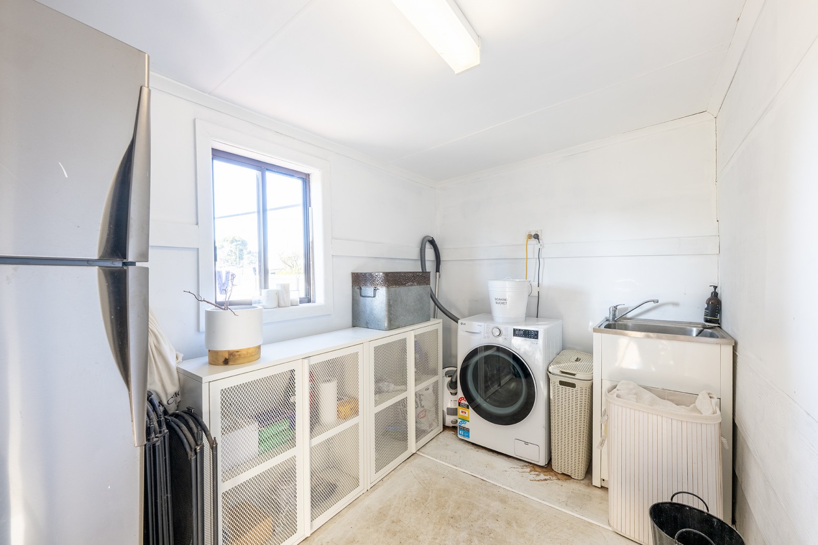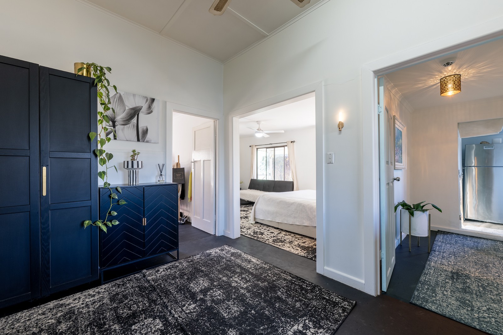 The home is currently used as an open-plan studio for a free-flowing lifestyle. However, barn doors can easily be added to create extra privacy between spaces if desired—including the laundry area, allowing for a more defined layout while still embracing open living.