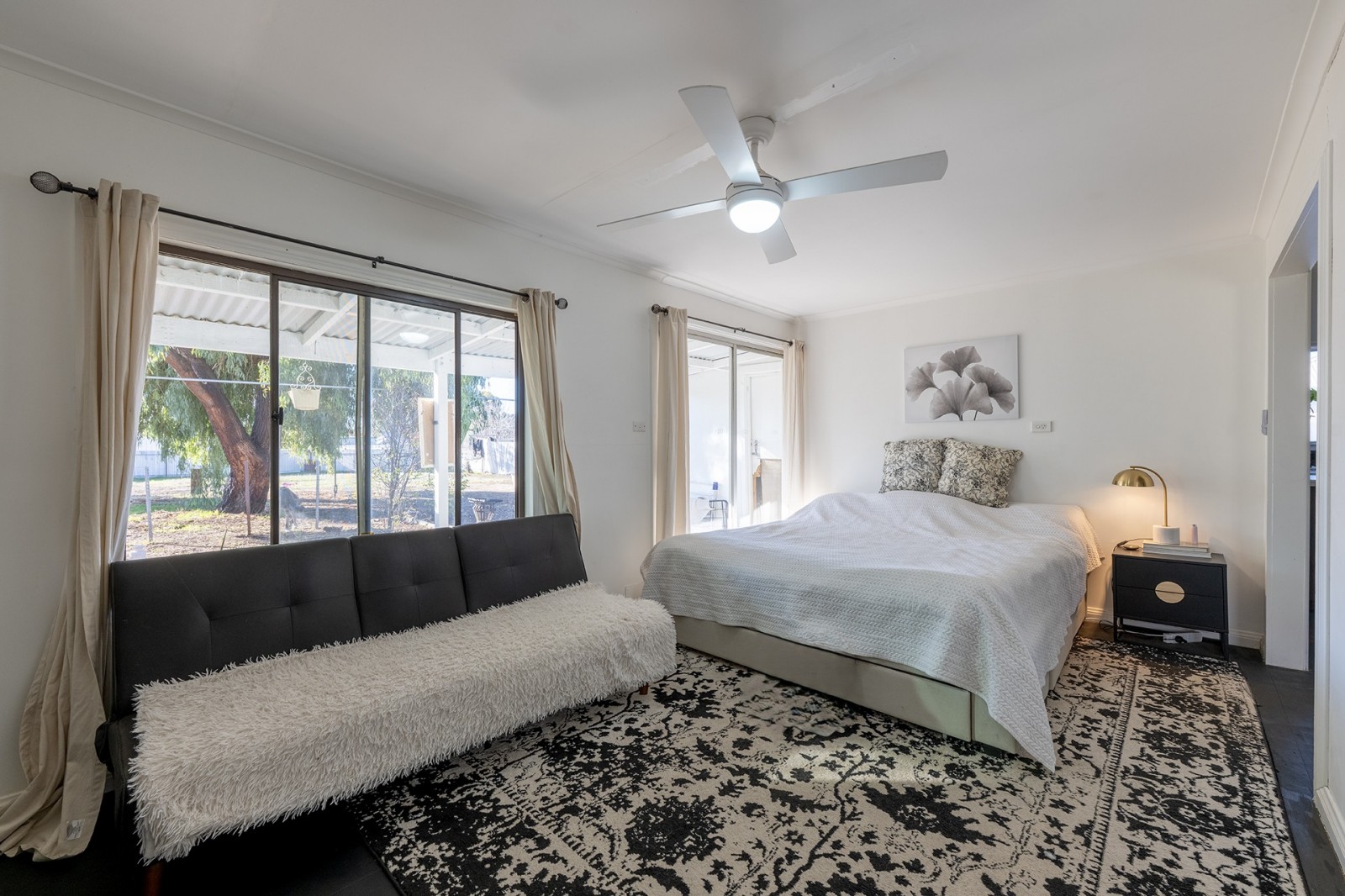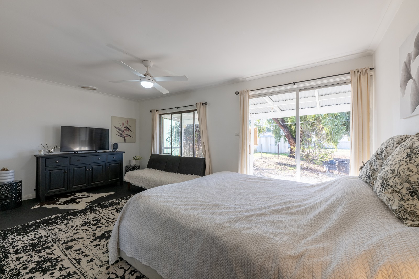- The main bedroom opens to the lush backyard with sliding doors that invite in the summer breeze and natural light