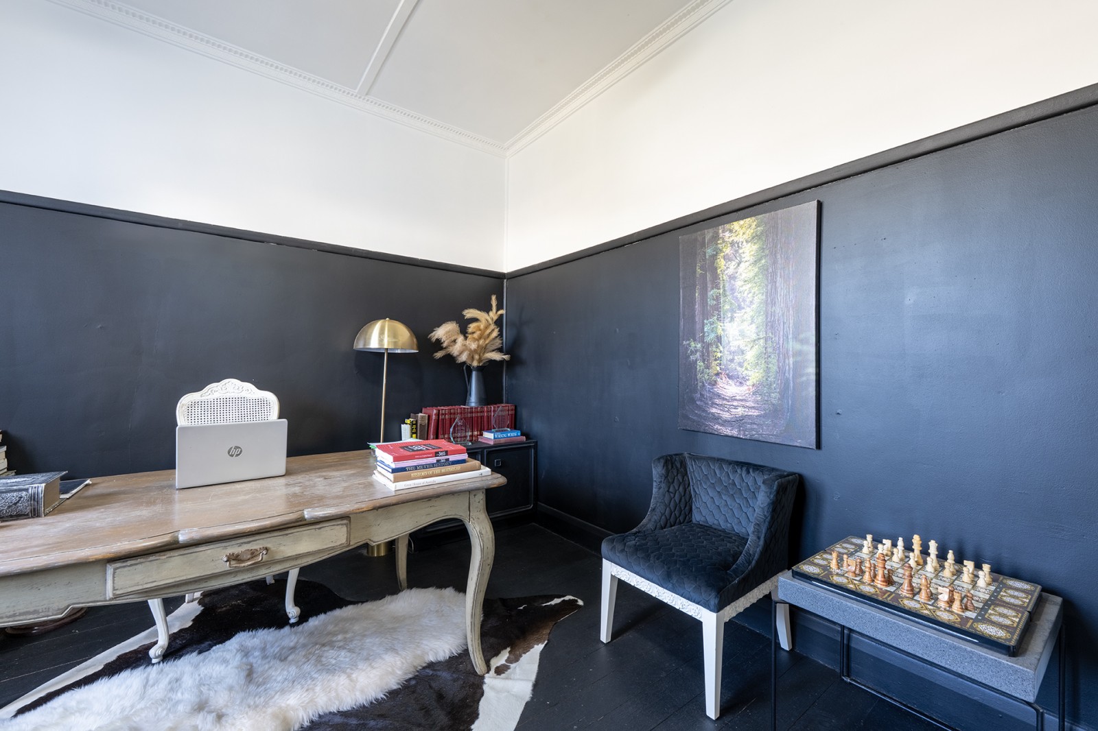 - One room serves as an inspiring home office and yoga space