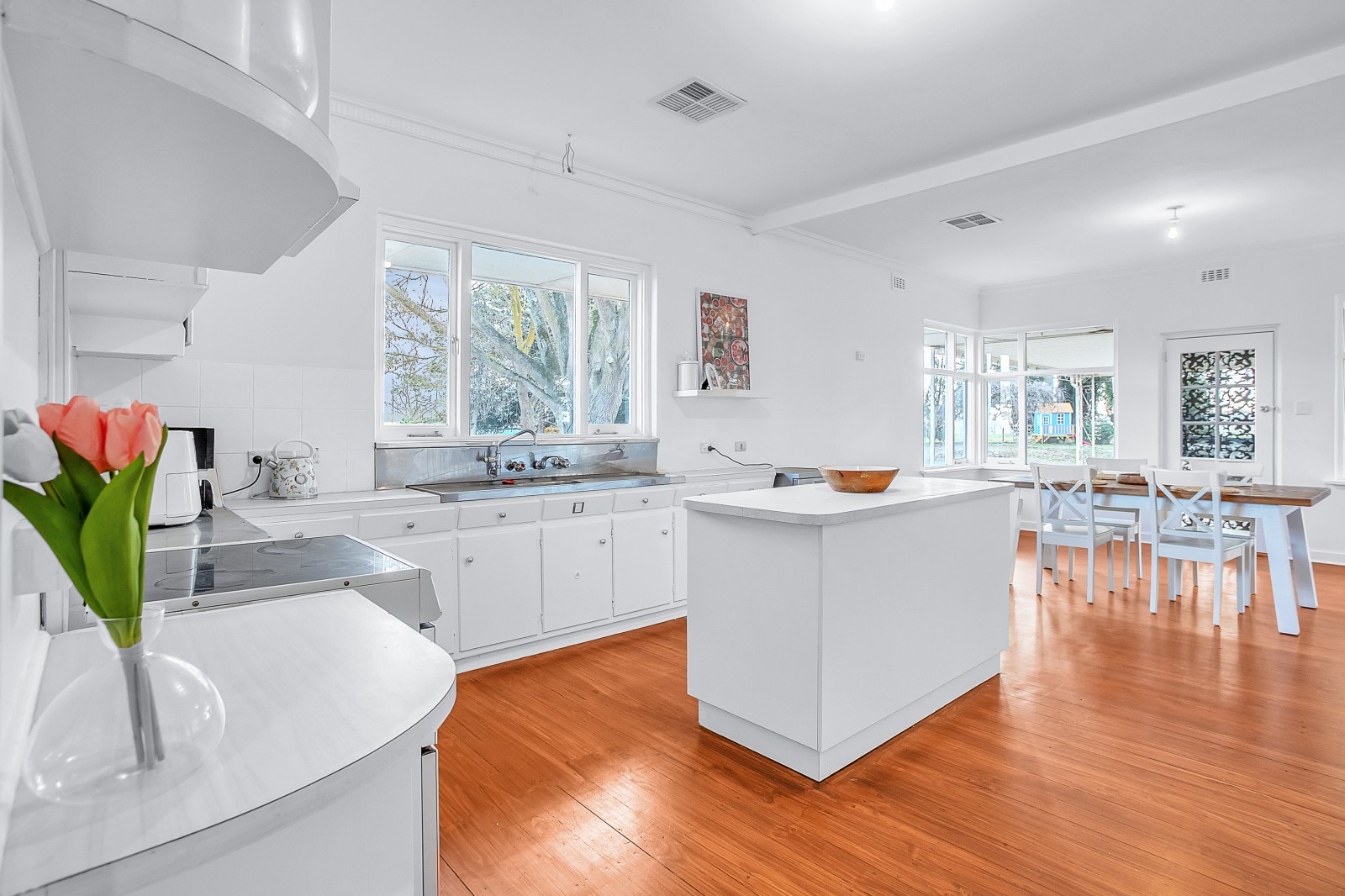 A four bedroom brick and stone home set back from the road amongst English trees allows for comfortable living. The home has recently been repainted and upgraded, including the installation of central heating to back up the slow combustion fire and the open fire with a feature stone fireplace. Large rooms, all bright with natural light.