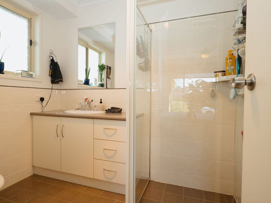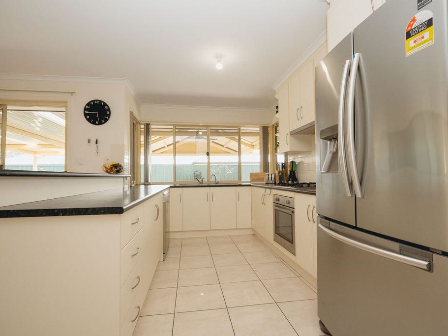 The galley kitchen provides long, raised breakfast bar, great bench area, cupboards and even a servery, ideal for barbecue under the pergola.