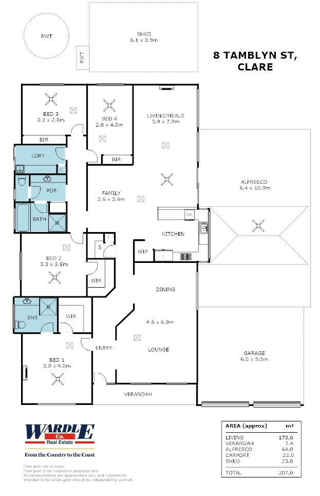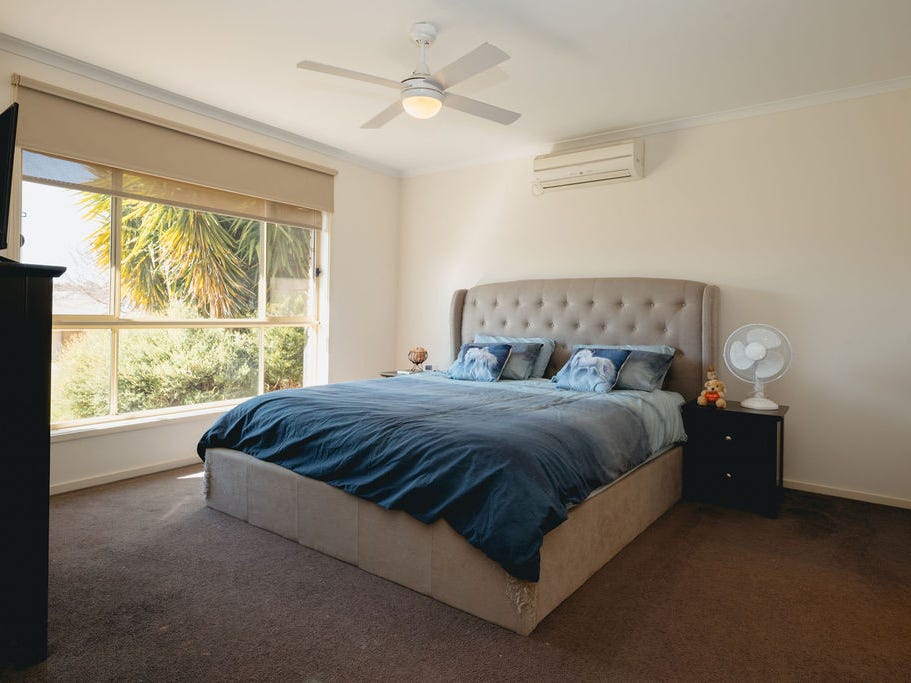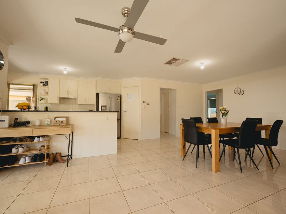 The Master bedroom offers a spacious ensuite and walk-in robe. Four bedrooms in total, all with ceiling fans, built-in wardrobes. Three-way bathroom with large vanity. Well-designed kitchen/dine and family room with reverse cycle split system and evaporative air conditioning ducted throughout.