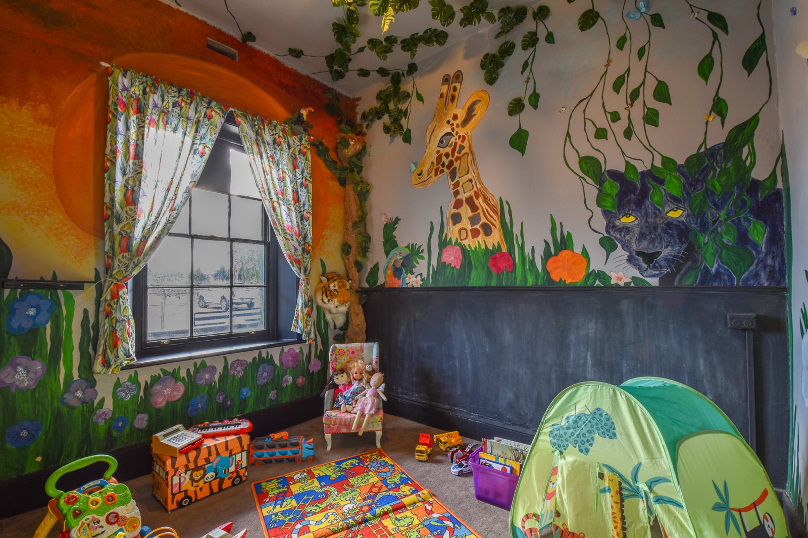 - Four versatile reception rooms, currently used as a sitting room with combustion fire, dining areas, and a kids' playroom