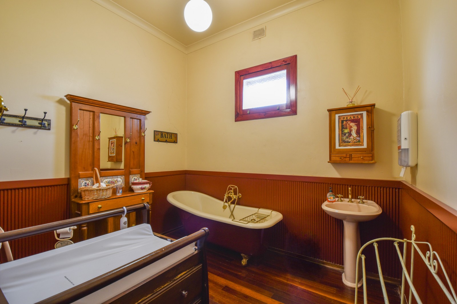 - A heritage-style bathroom with clawfoot bath, toilet and basin, plus separate men’s facilities