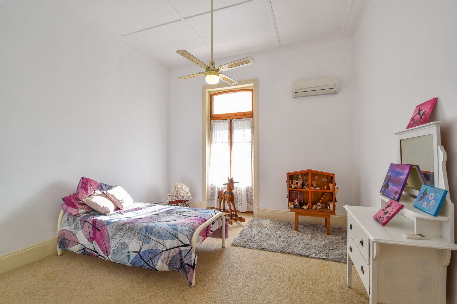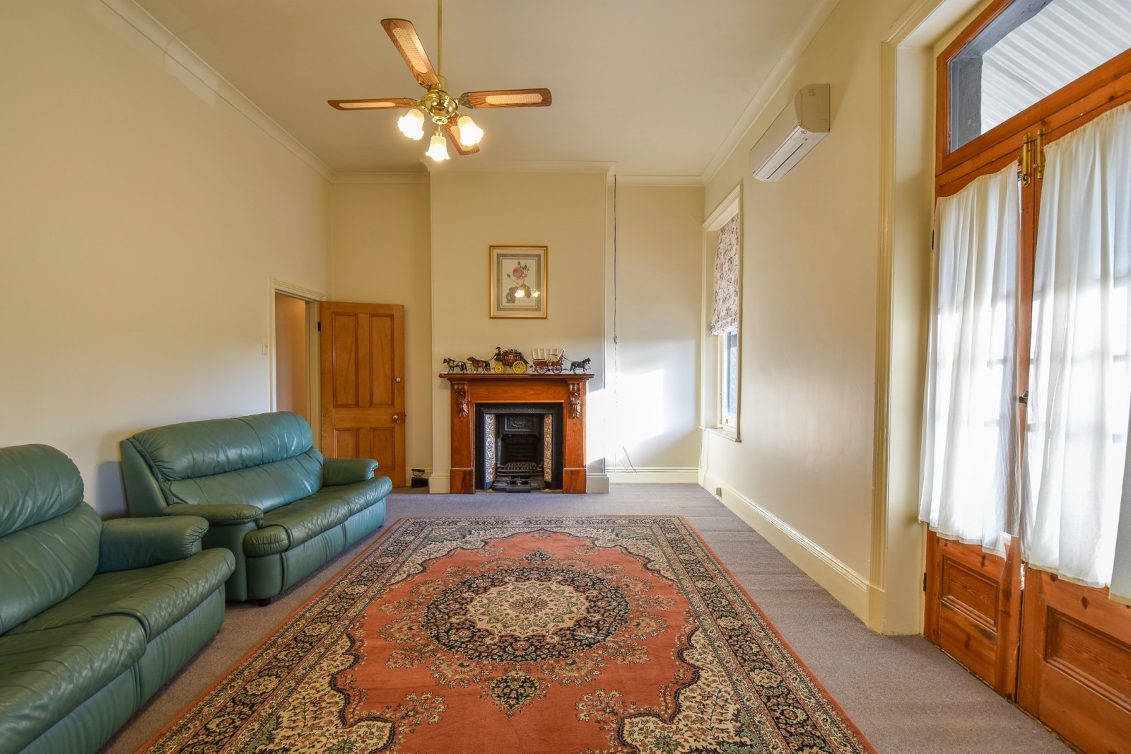- A large lounge room with French doors, split system air conditioning, and ornate fireplace