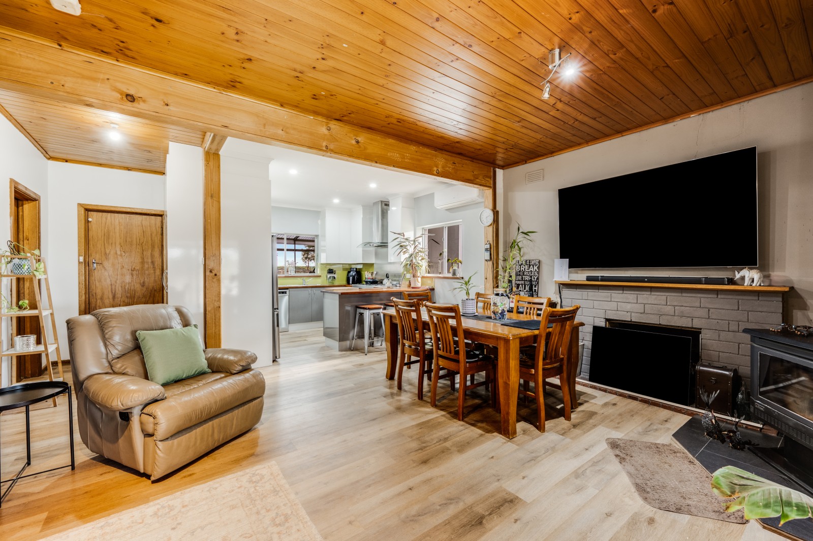 - Open plan kitchen, living and dining with slow combustion fire and split system A/C