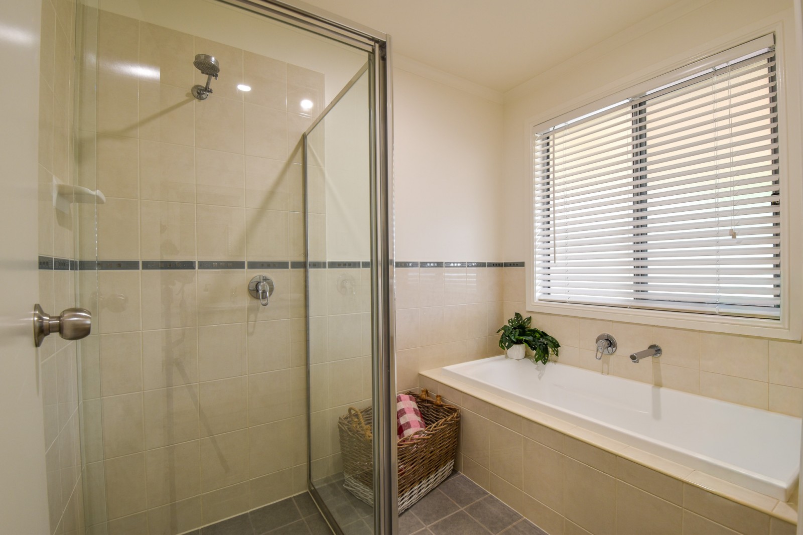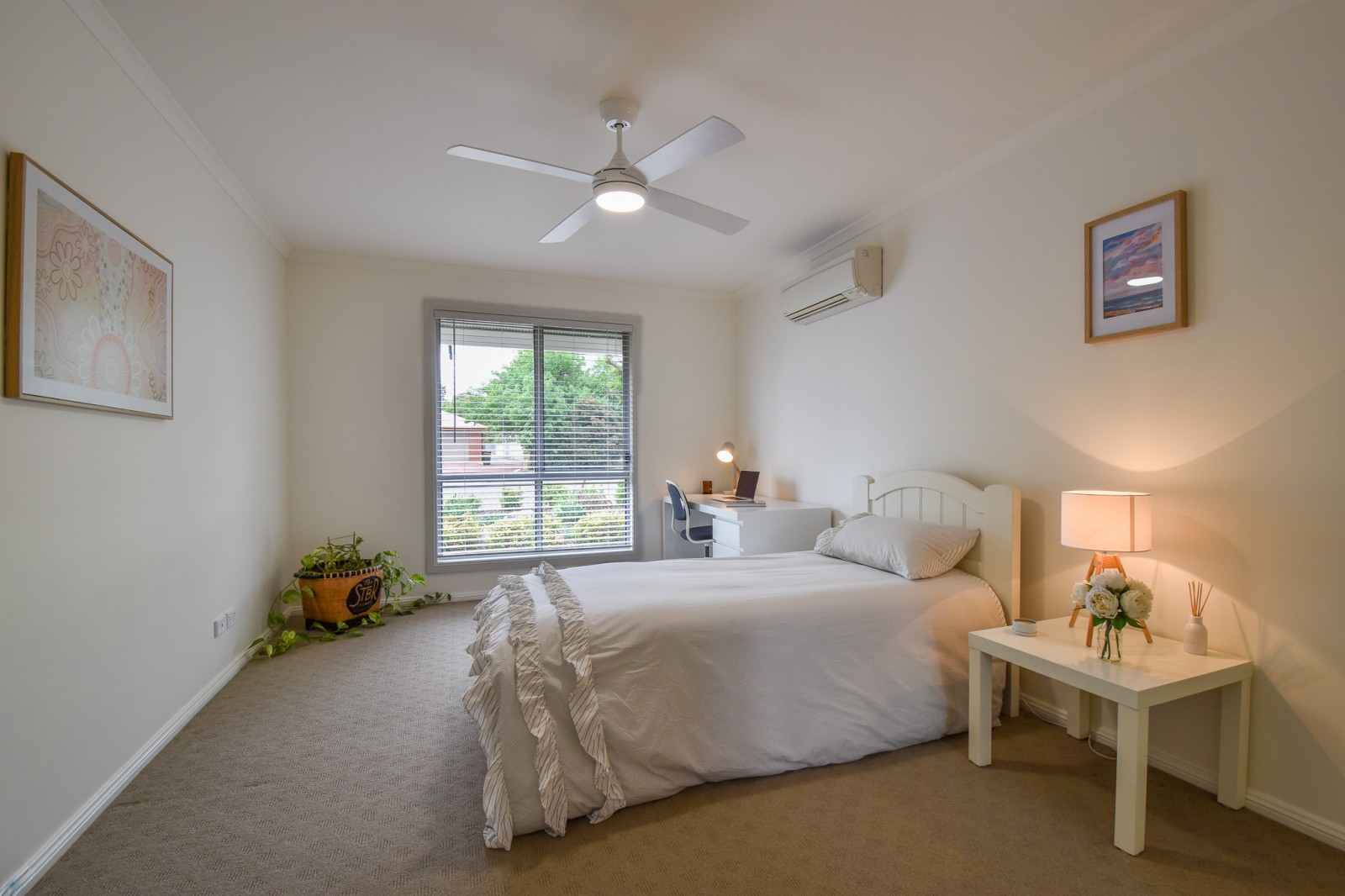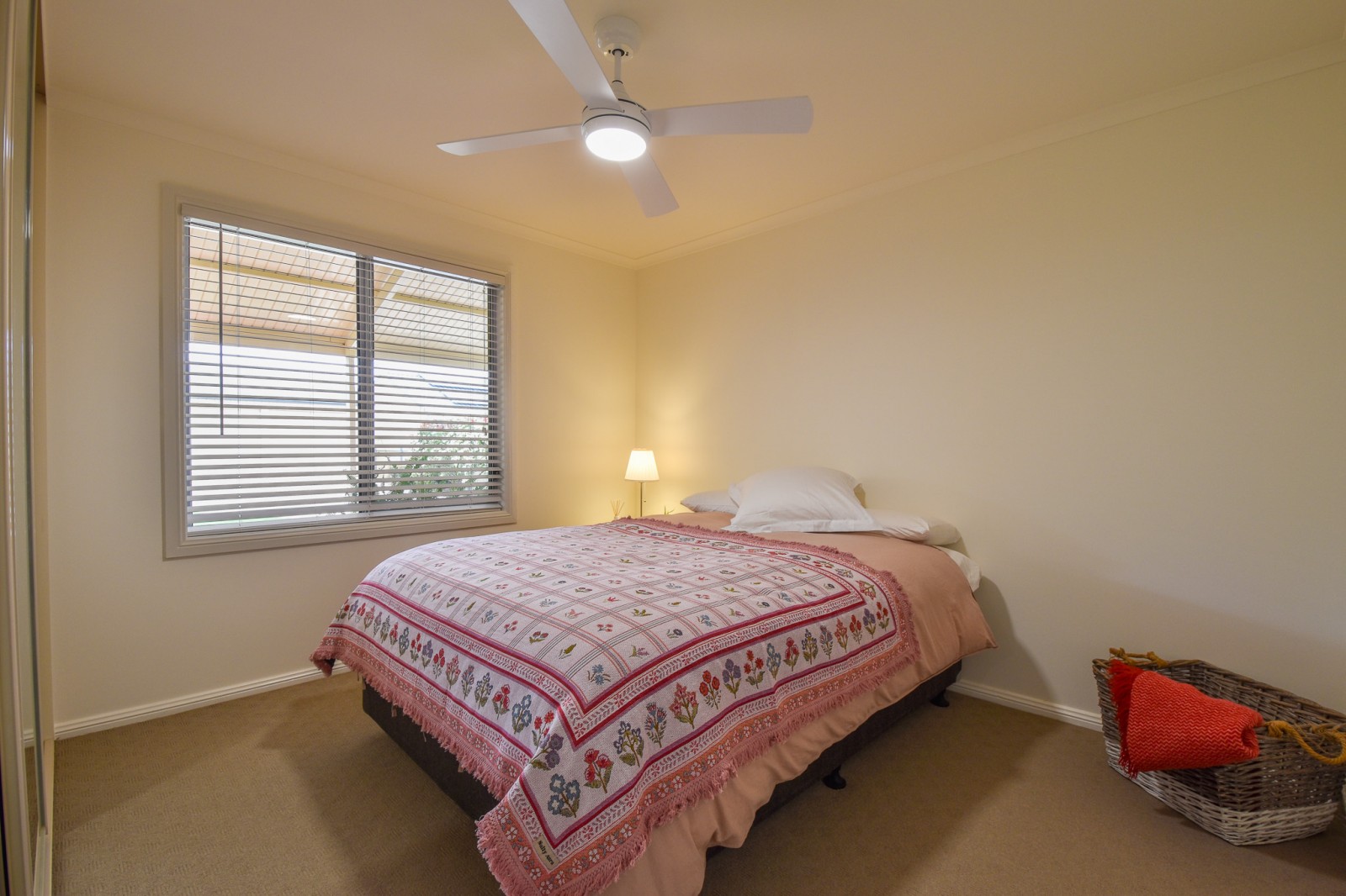 The master bedroom offers a peaceful sanctuary, complete with his and hers built-in robes and a private ensuite featuring a bath, shower, vanity, and toilet. Each additional bedroom includes built-in robes, carpet flooring, and ceiling fans for year-round comfort. A practical three-way bathroom and tidy laundry with built-in storage add to the home’s functionality.