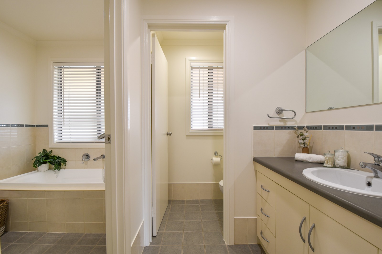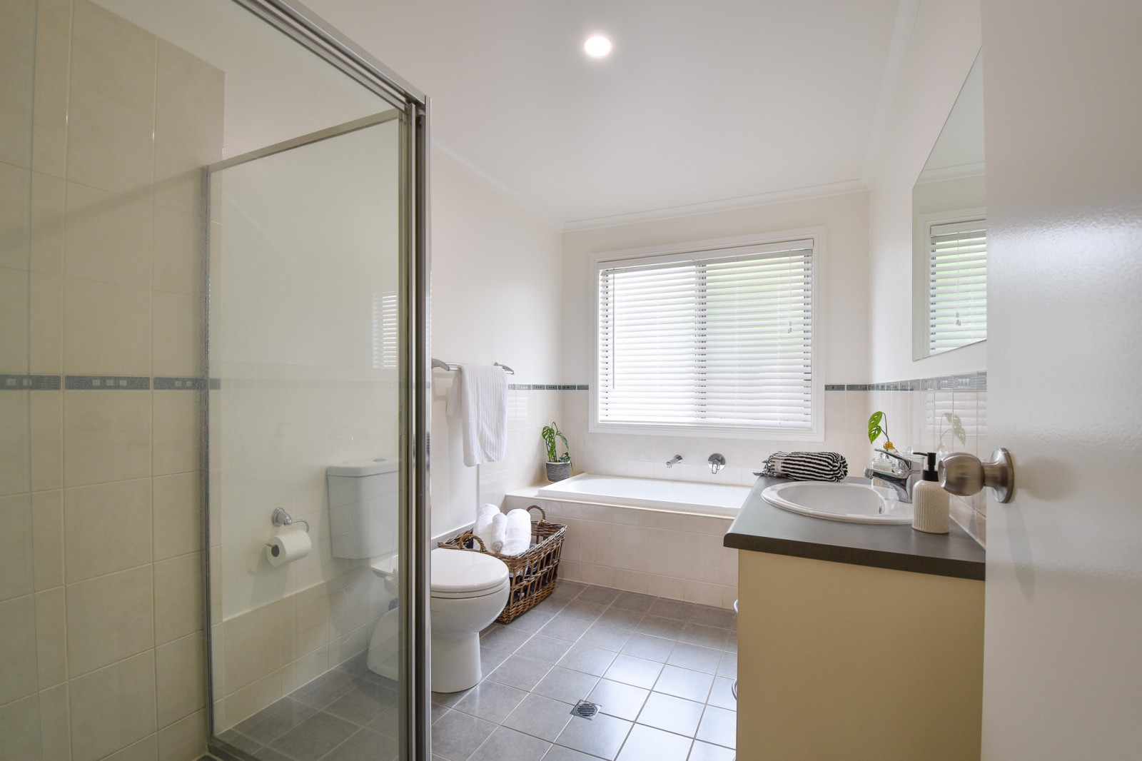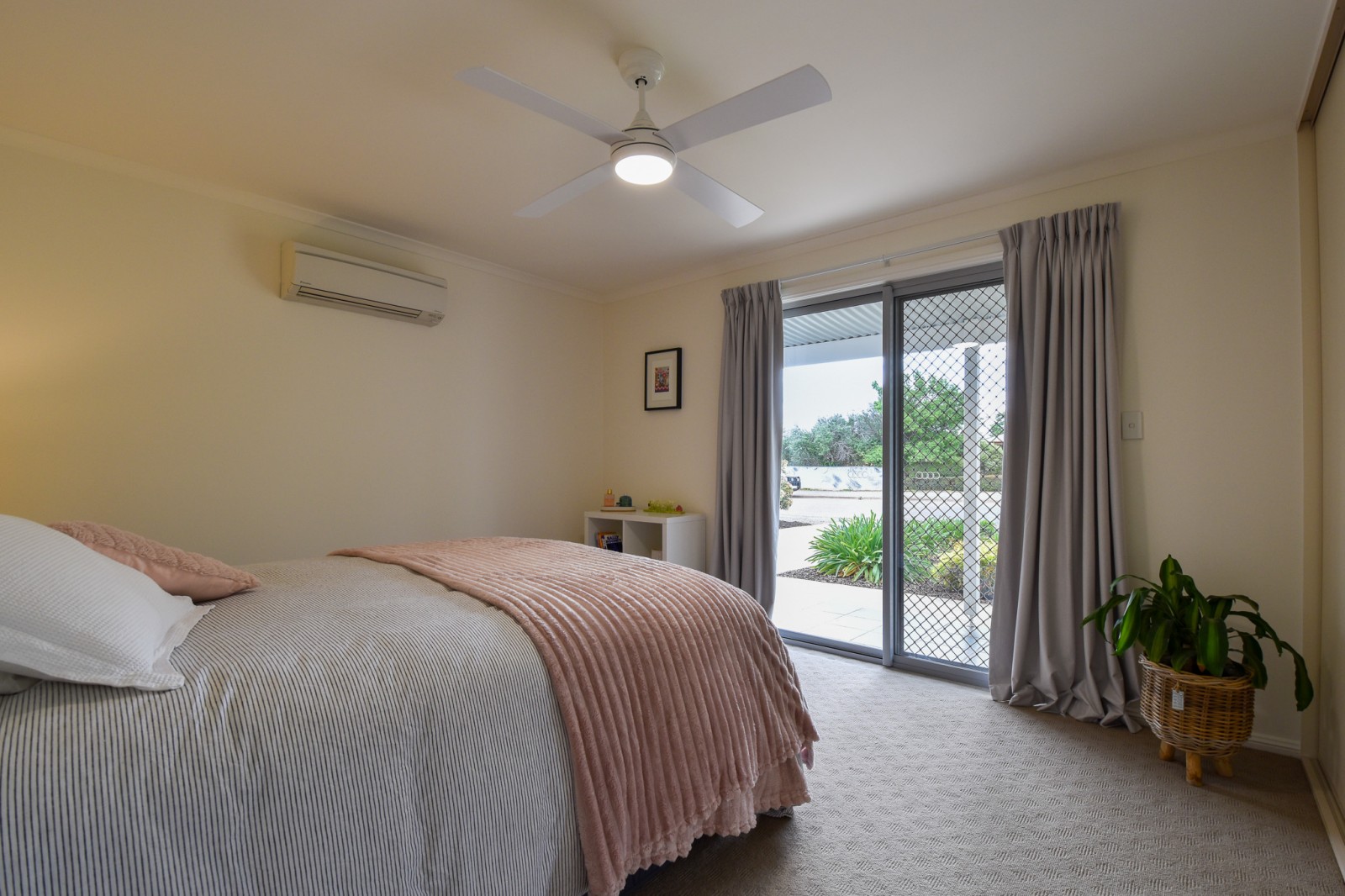 The master bedroom offers a peaceful sanctuary, complete with his and hers built-in robes and a private ensuite featuring a bath, shower, vanity, and toilet. Each additional bedroom includes built-in robes, carpet flooring, and ceiling fans for year-round comfort. A practical three-way bathroom and tidy laundry with built-in storage add to the home’s functionality.