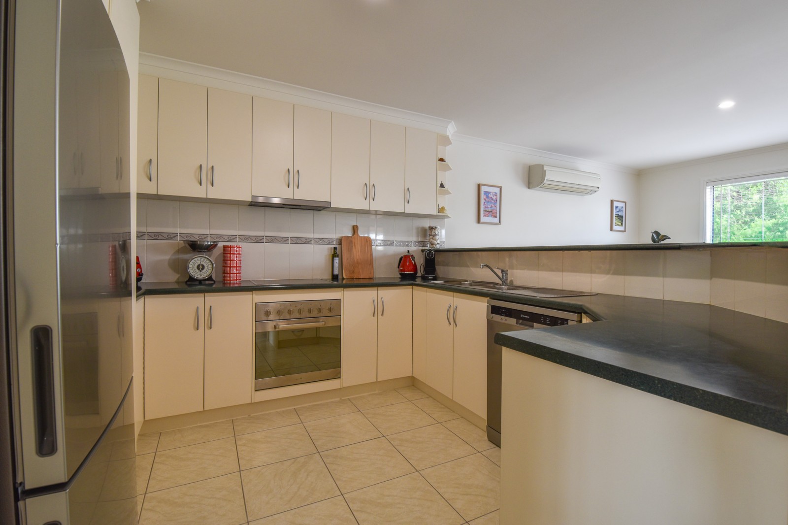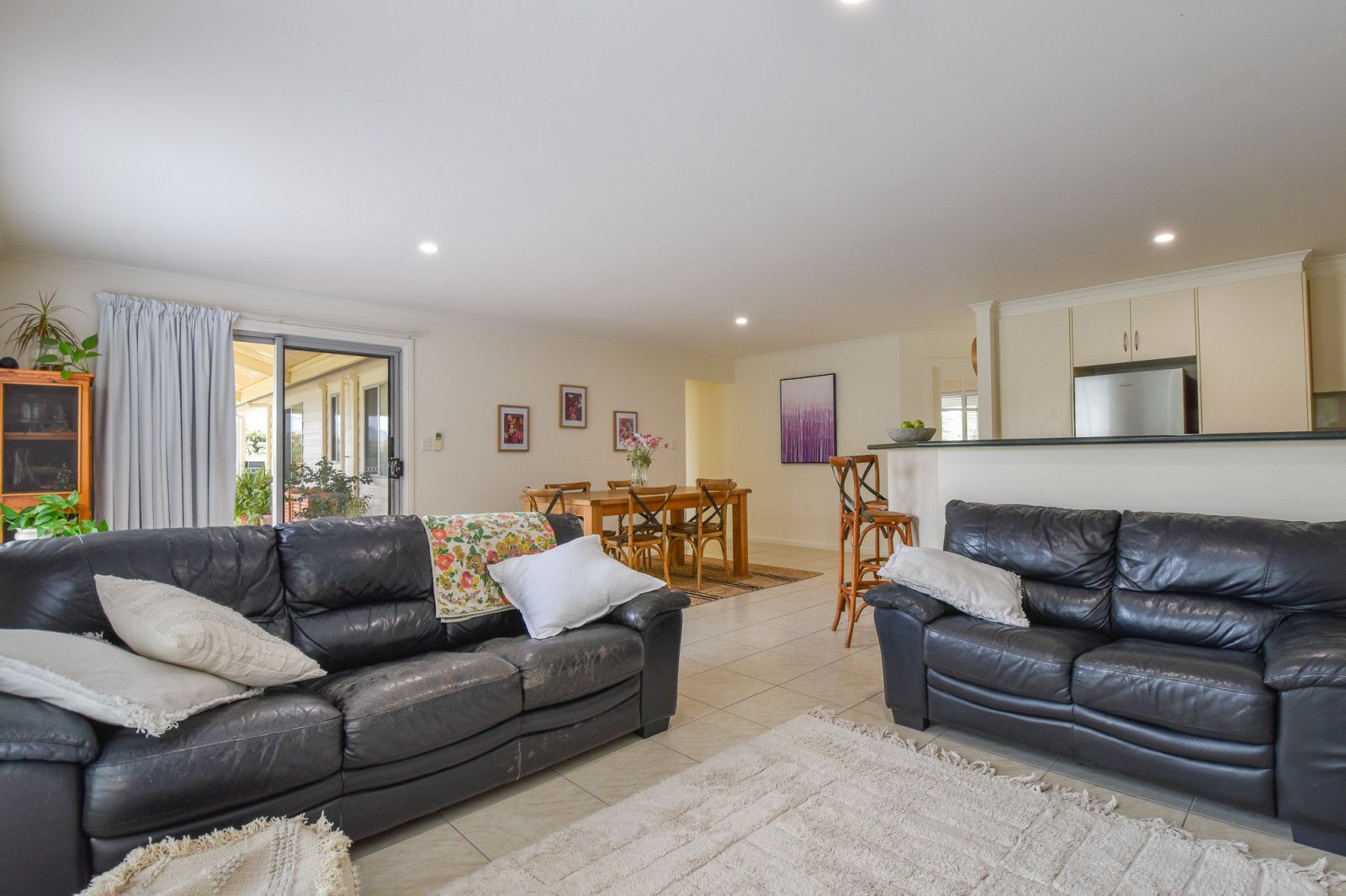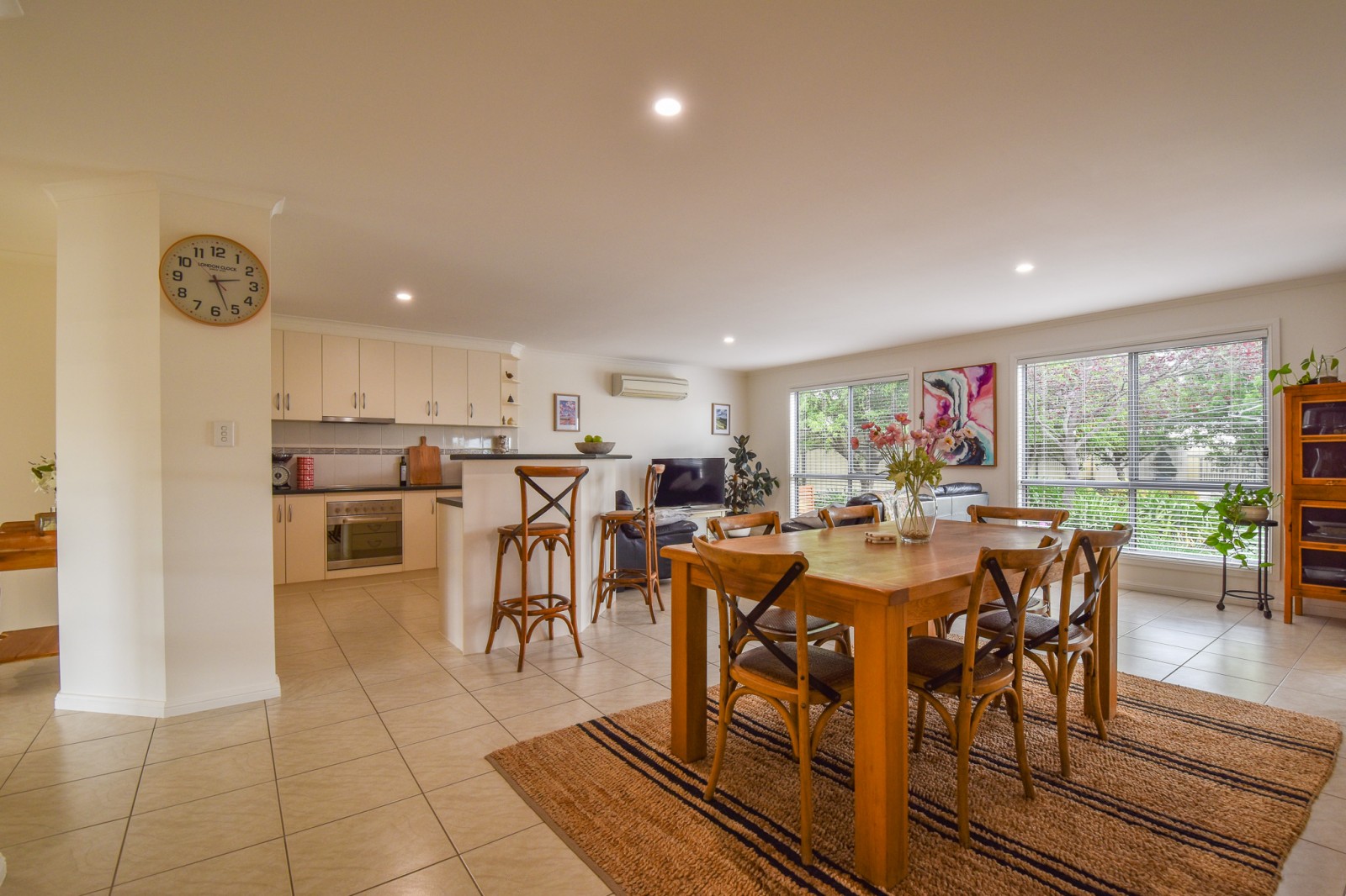 The open-plan kitchen, dining, and living area is bathed in natural light, creating a space that feels both inviting and functional. The kitchen features modern laminate benchtops, an electric under-bench oven and cooktop, plus a stainless steel dishwasher all overlooking the main living zone so you’re never far from the family.