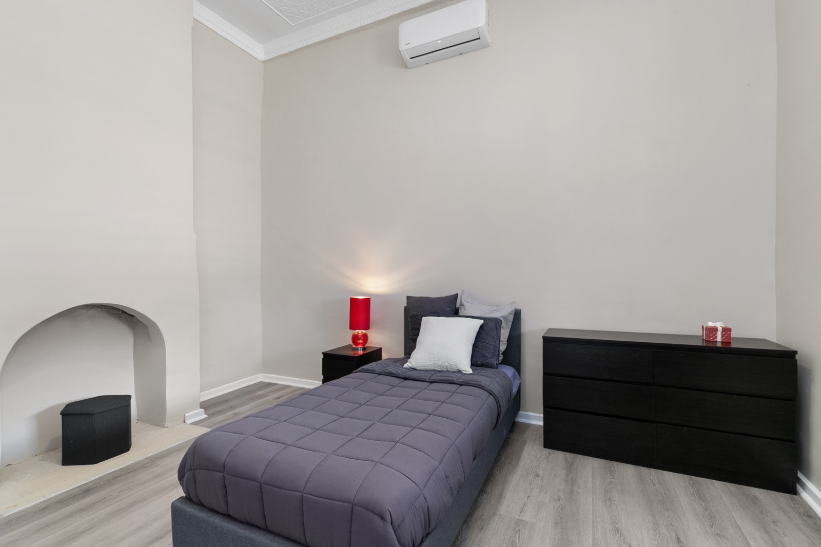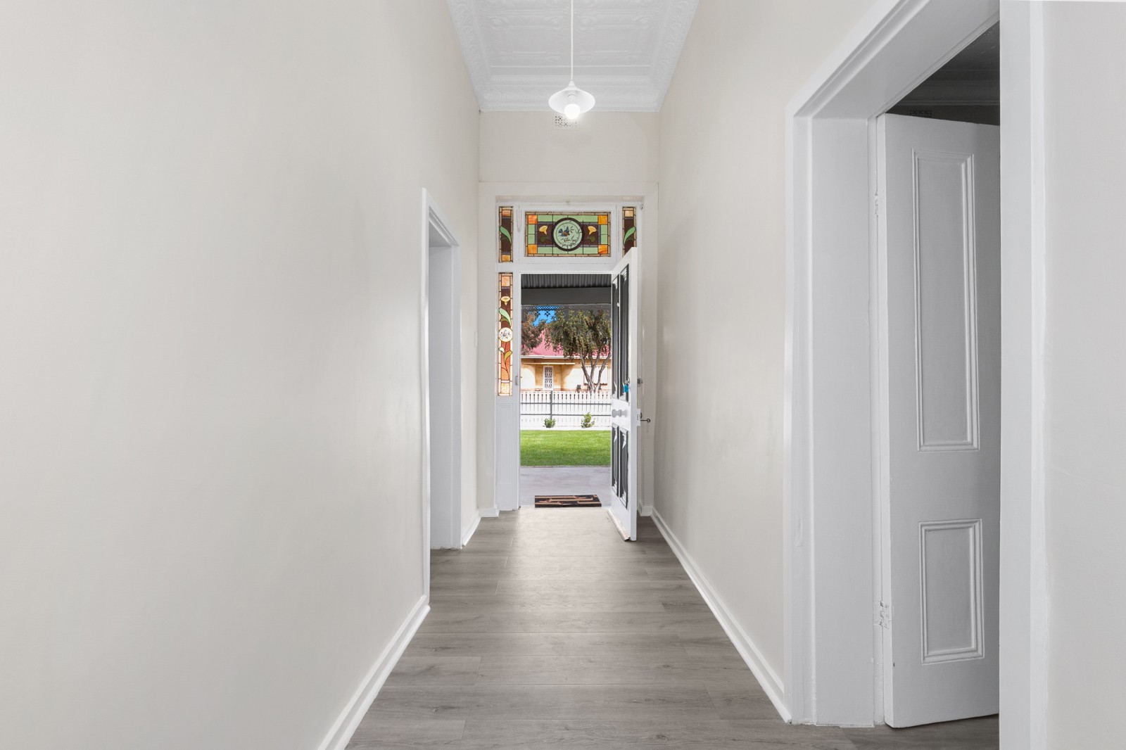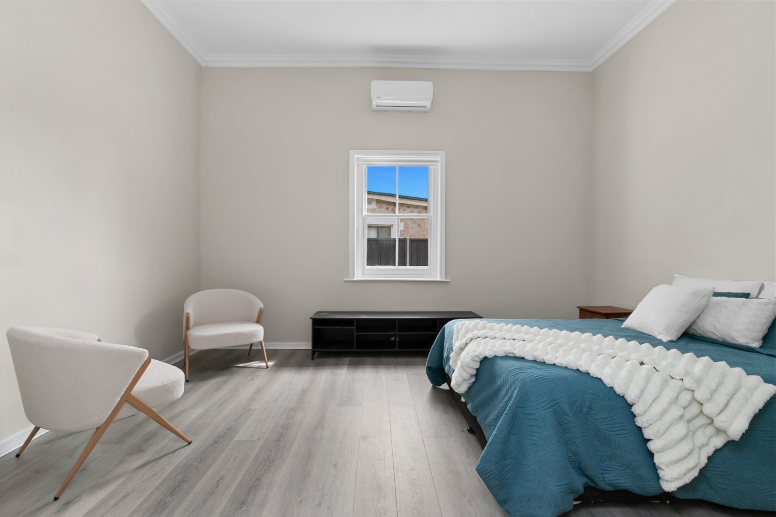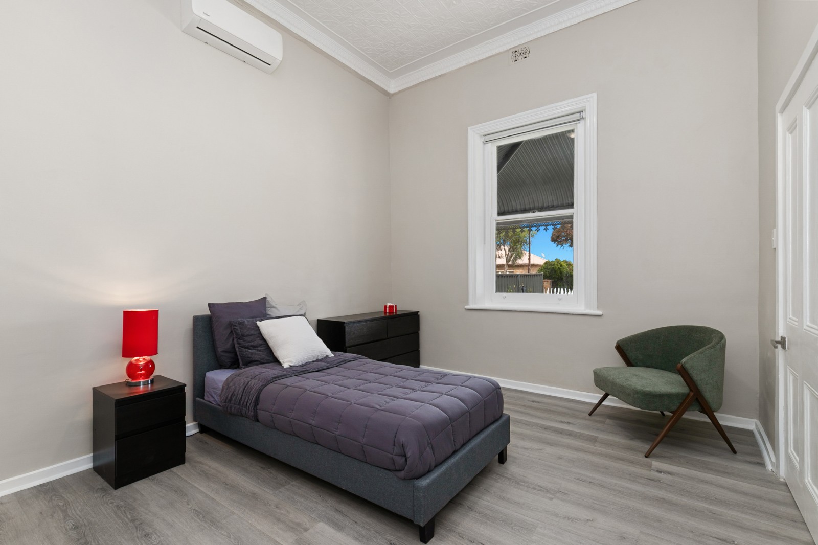 Beyond the classic white picket fence, a story unfolds. Step inside to find three bedrooms, two adorned with exquisite, pressed tin ceilings — a nod to the home’s historic soul. Each room feels warm and inviting, complete with new flooring, ceiling fans, and split system air conditioning, ensuring comfort in every season.