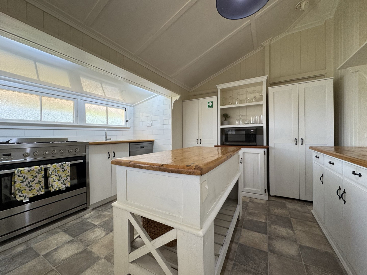 • Bright open kitchen with timber bench tops, large island bench, dishwasher, large 900mm stainless steel gas stove with electric oven, adjacent dining room and breakfast bar