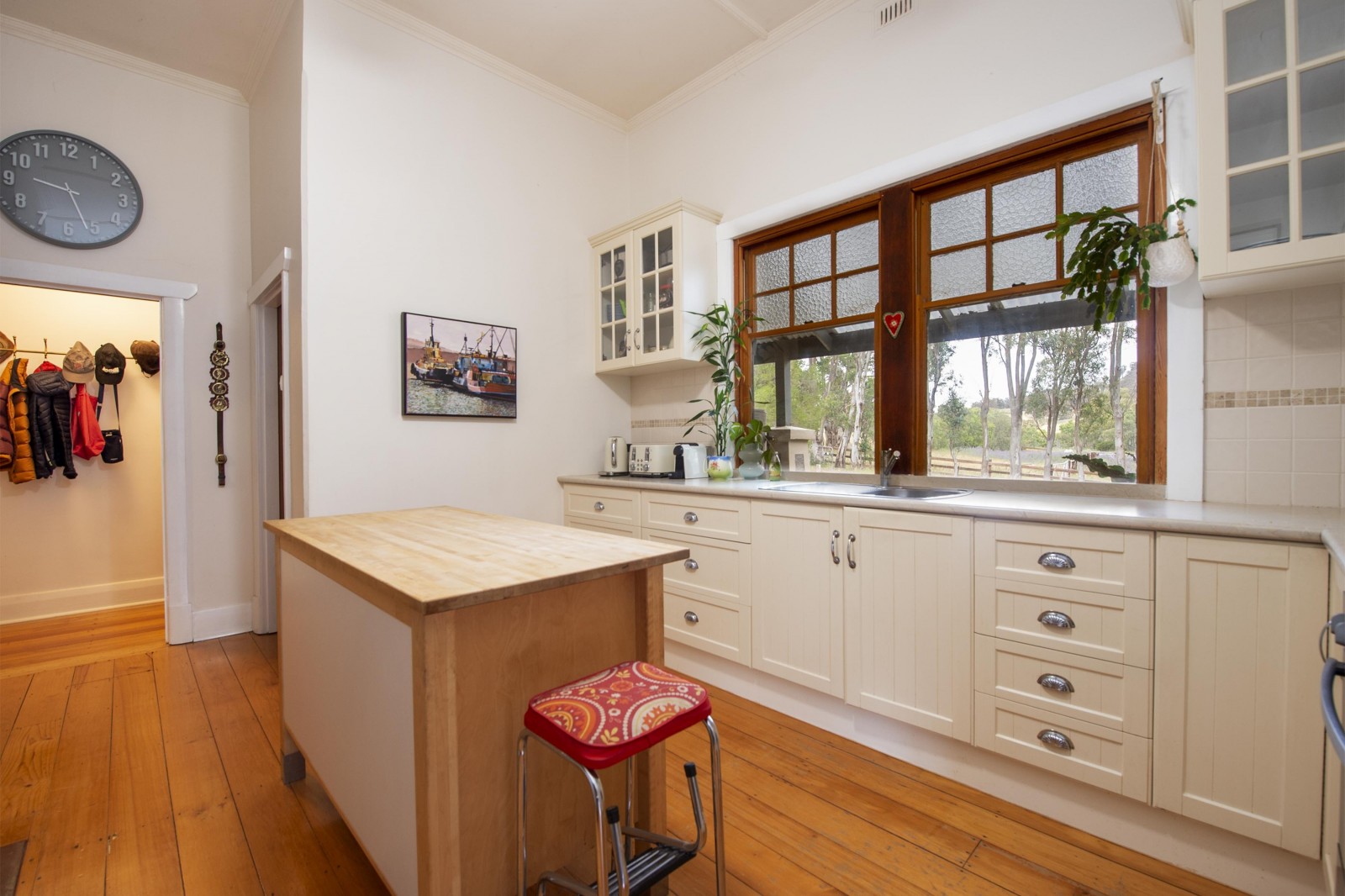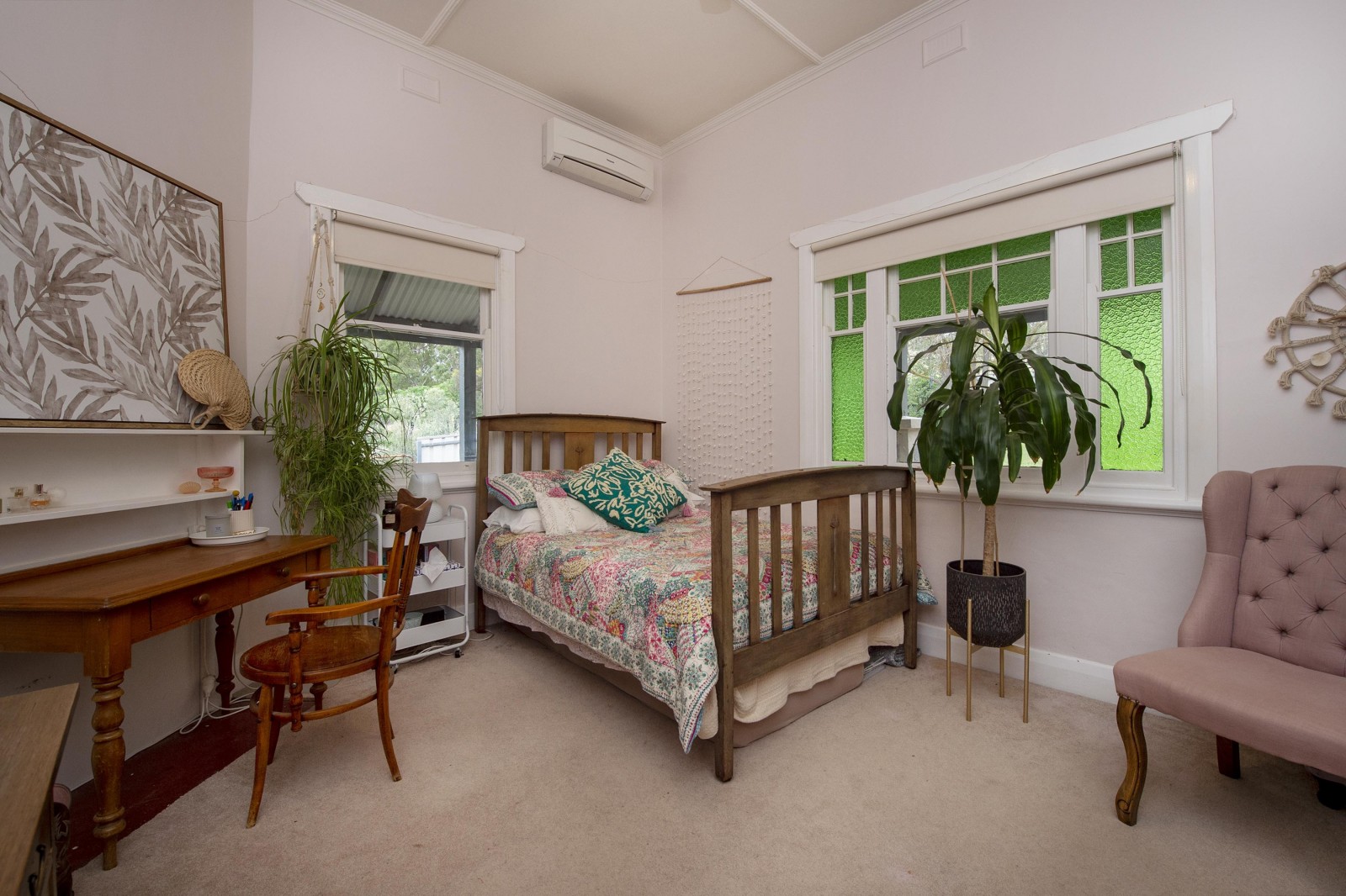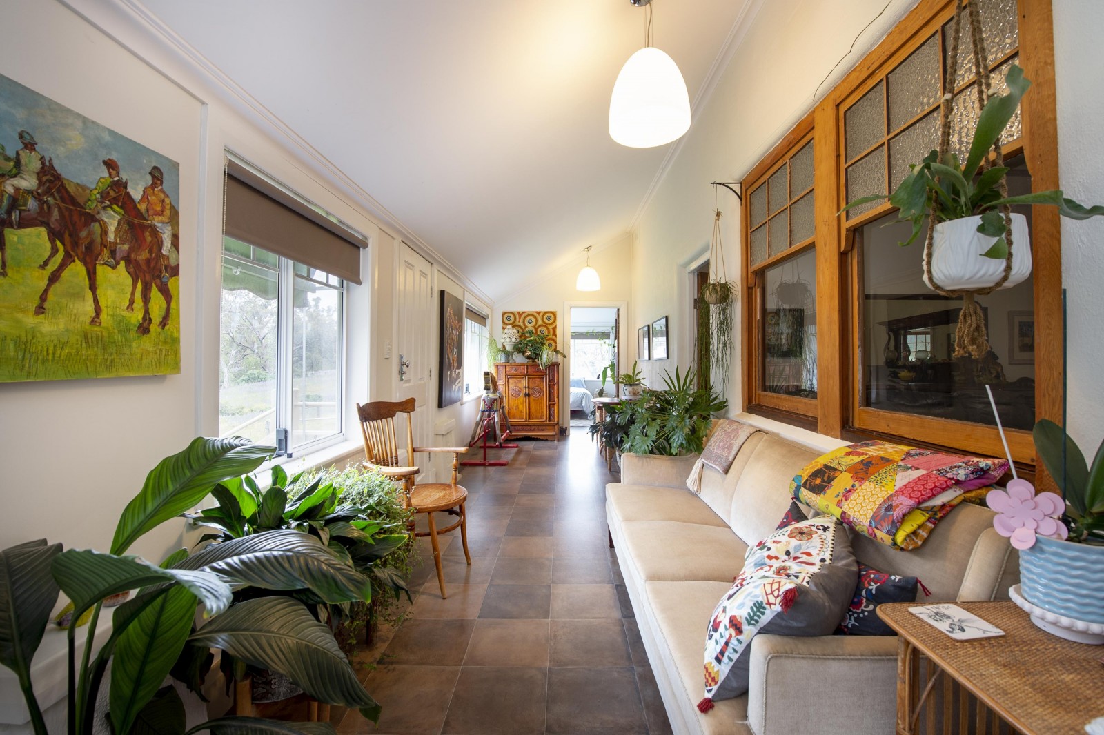 Beautifully positioned amongst gums and abundant birdlife, the residence blends original charm with modern comfort. High 11-foot ceilings, leadlight windows and a wide hallway anchor the home’s character, while thoughtful updates make everyday living easy. The home is now presented as four full bedrooms with the option of a fifth, ideal for families or guest accommodation. A recently upgraded bathroom, fully enclosed verandah, generous open office and a light-filled sunroom provide flexible living spaces. The large lounge offers combustion heating, ceiling fans and split-system air conditioning, while the country kitchen features an old Aga stove and a walk-in pantry.