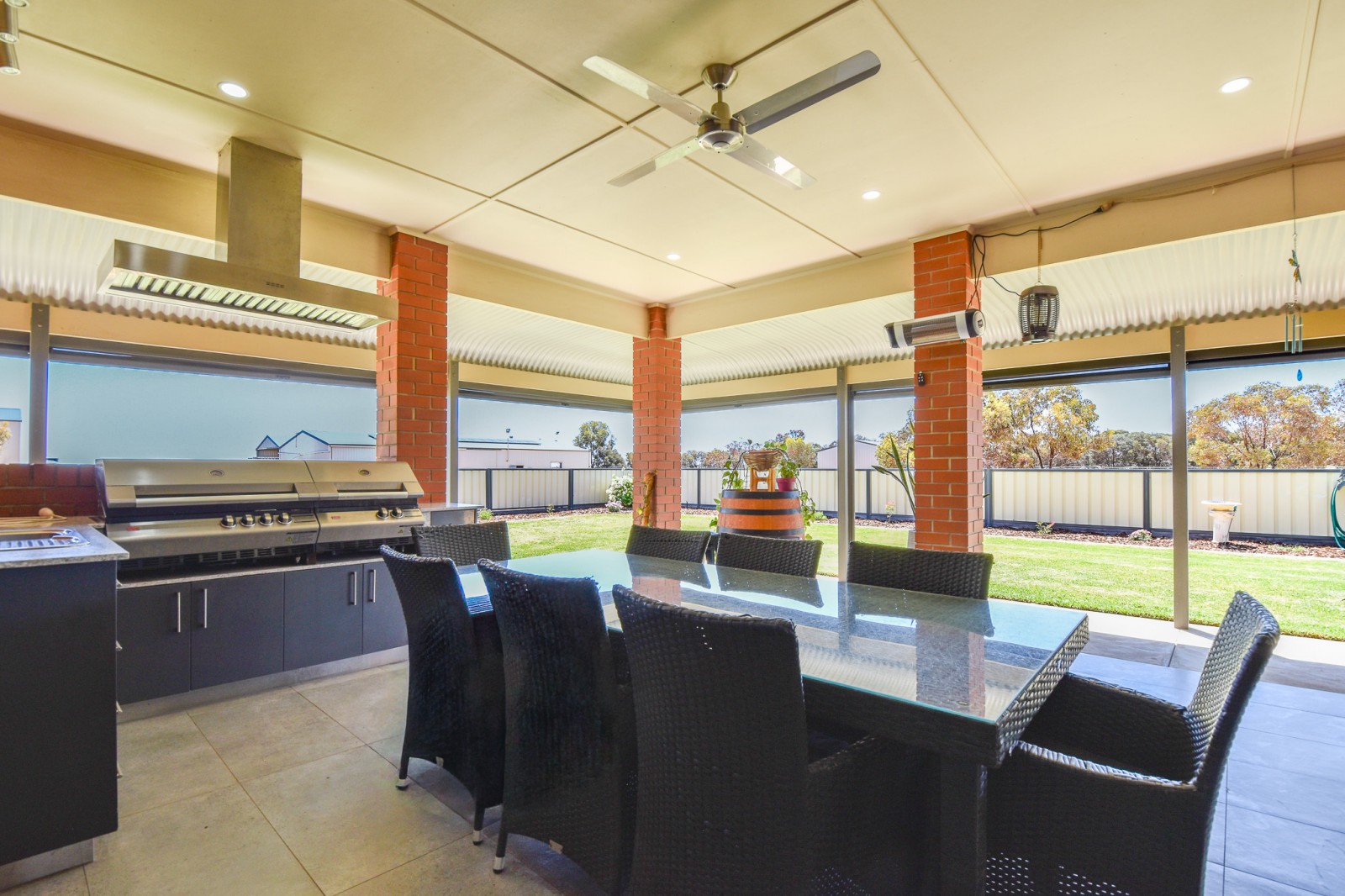 - Large alfresco, perfect for all-season entertaining, complete with zip-track blinds, built-in BBQ with exhaust, and wall-mounted TV