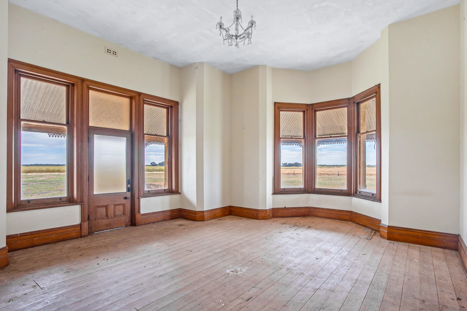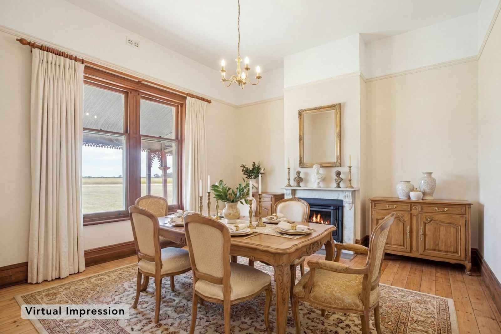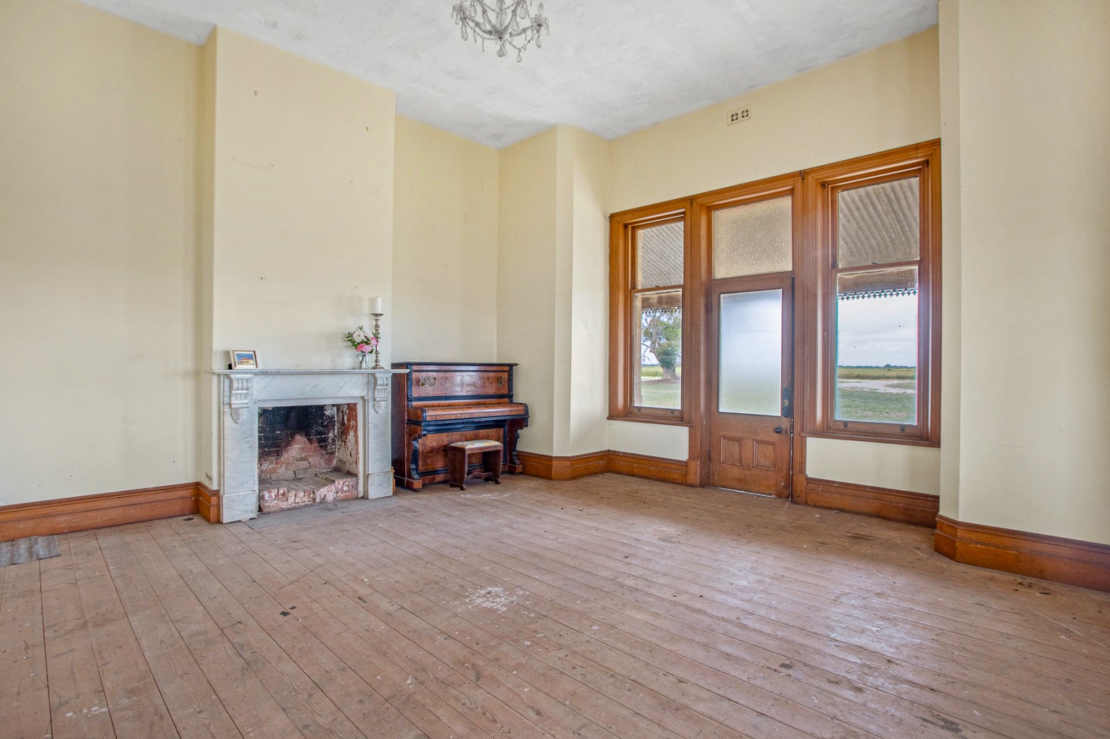 - Large formal living room with marble fireplace, East facing bay window with original timber sash windows, North facing door opening onto the verandah, polished timber floors and sweeping rural views