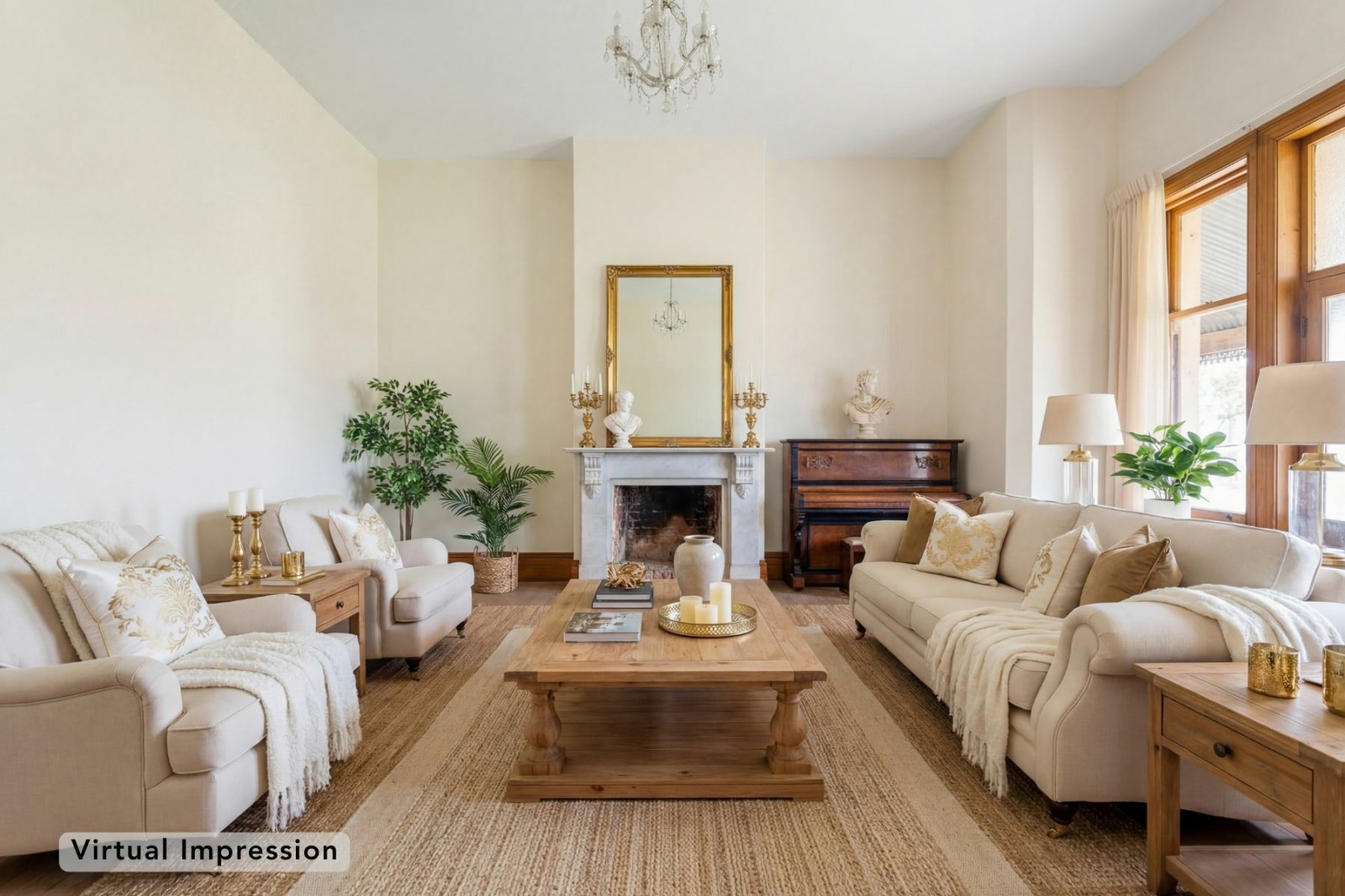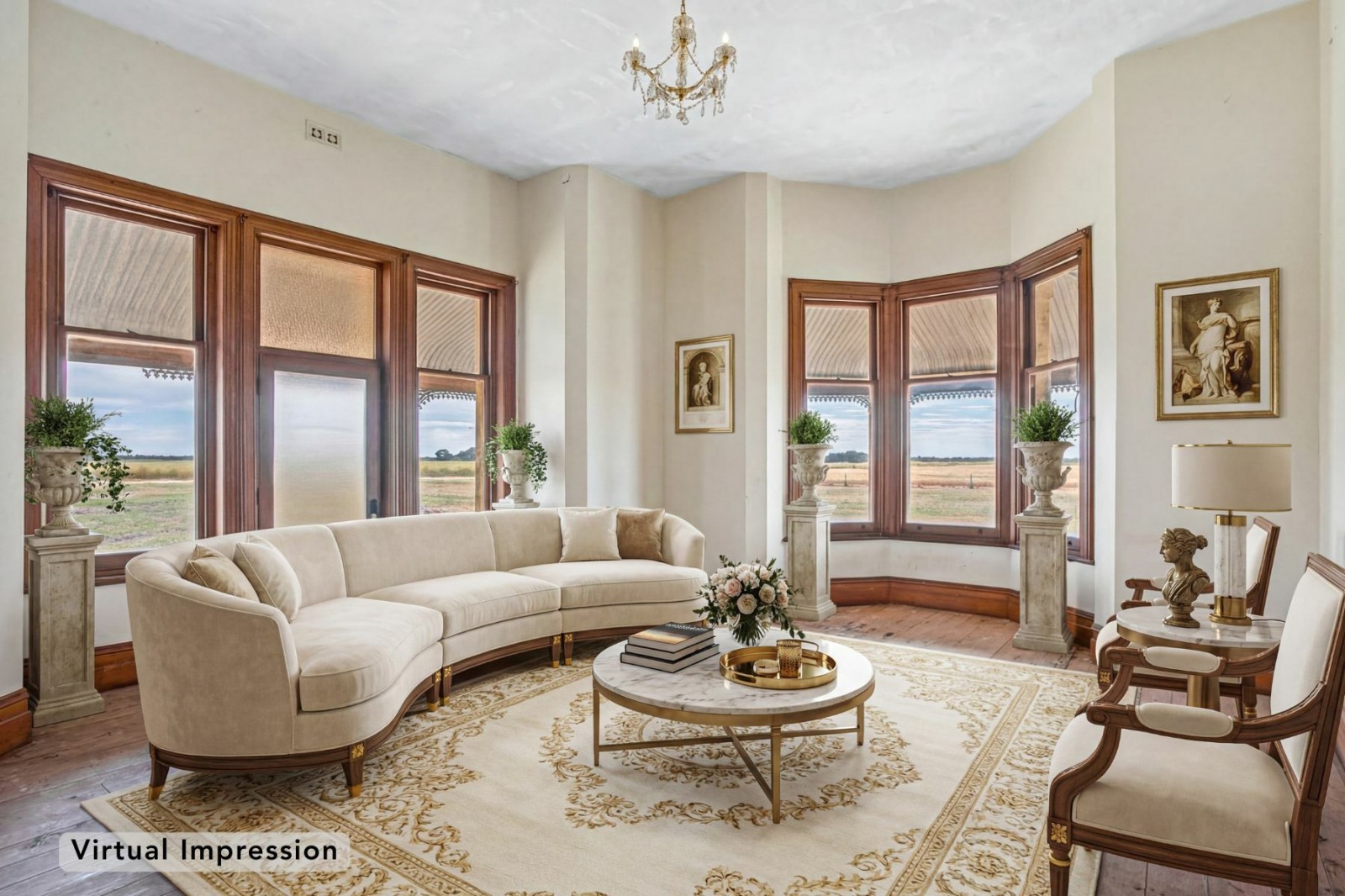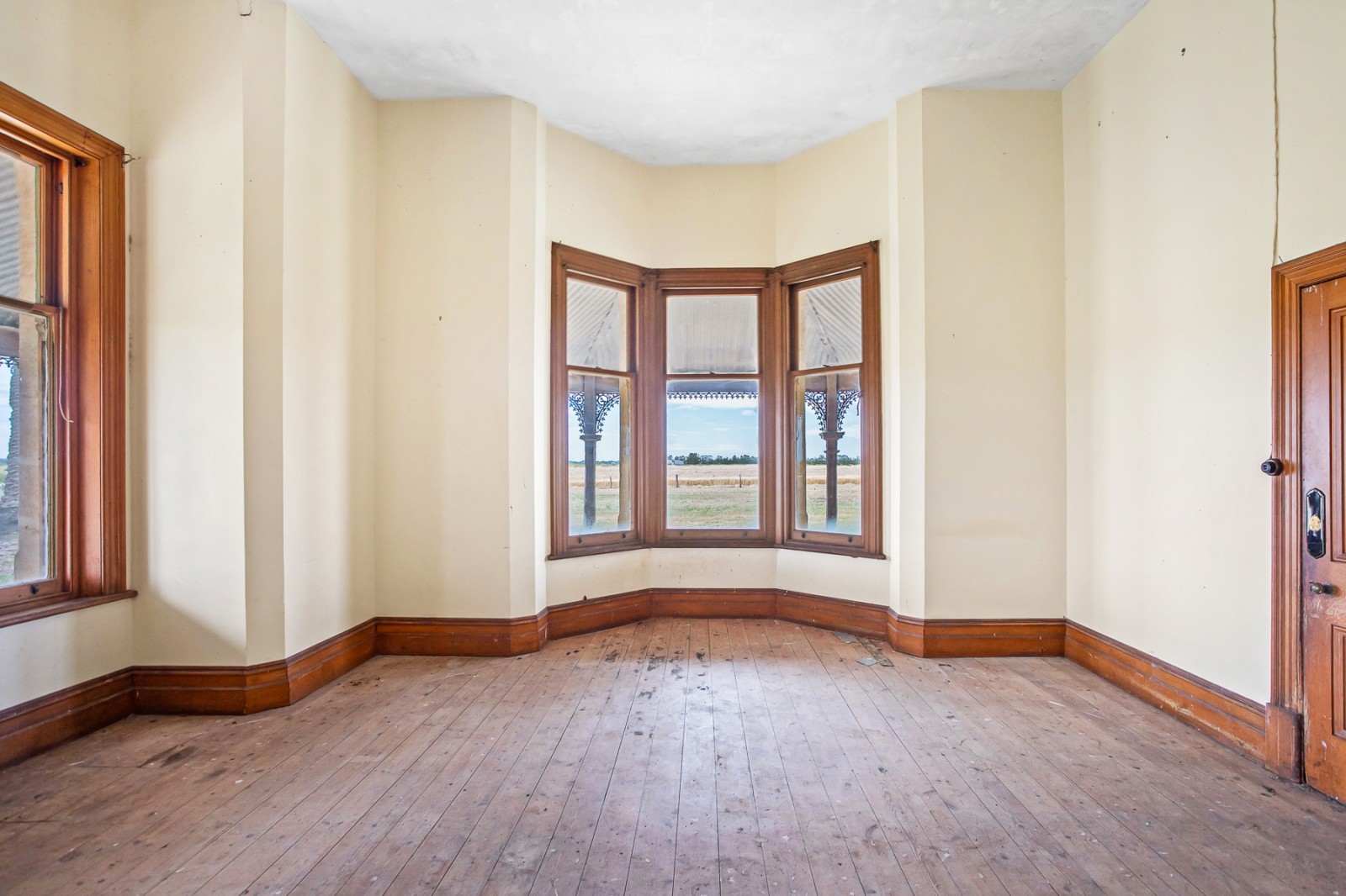 - Large formal living room with marble fireplace, East facing bay window with original timber sash windows, North facing door opening onto the verandah, polished timber floors and sweeping rural views