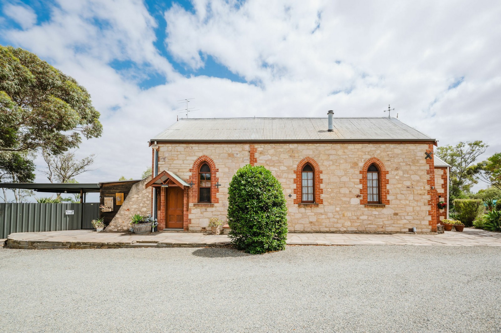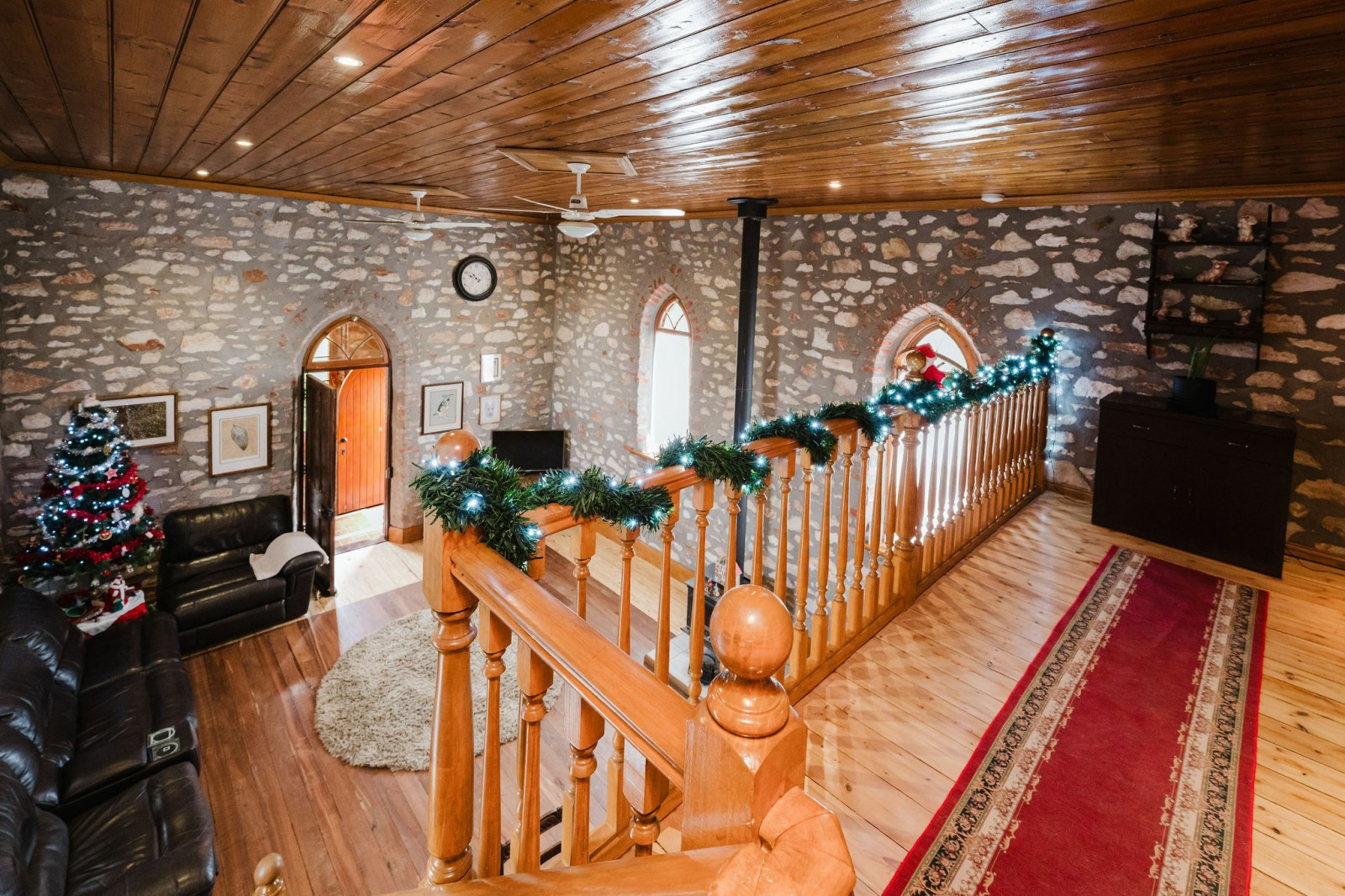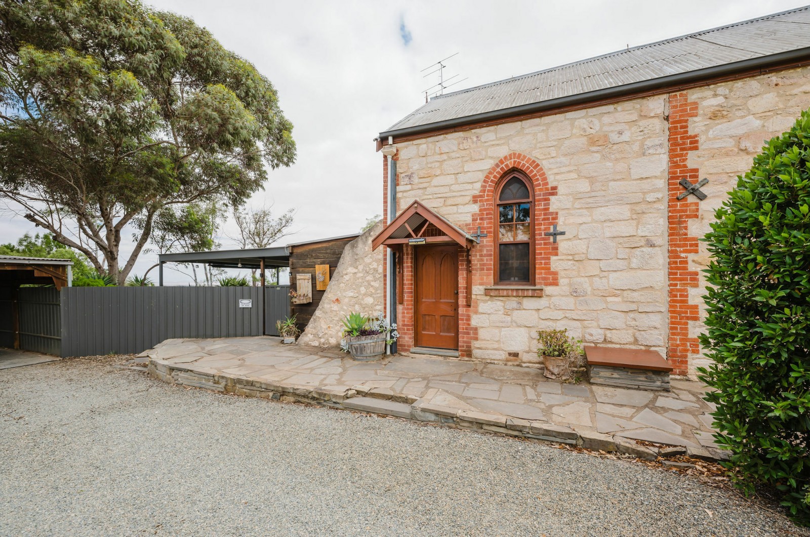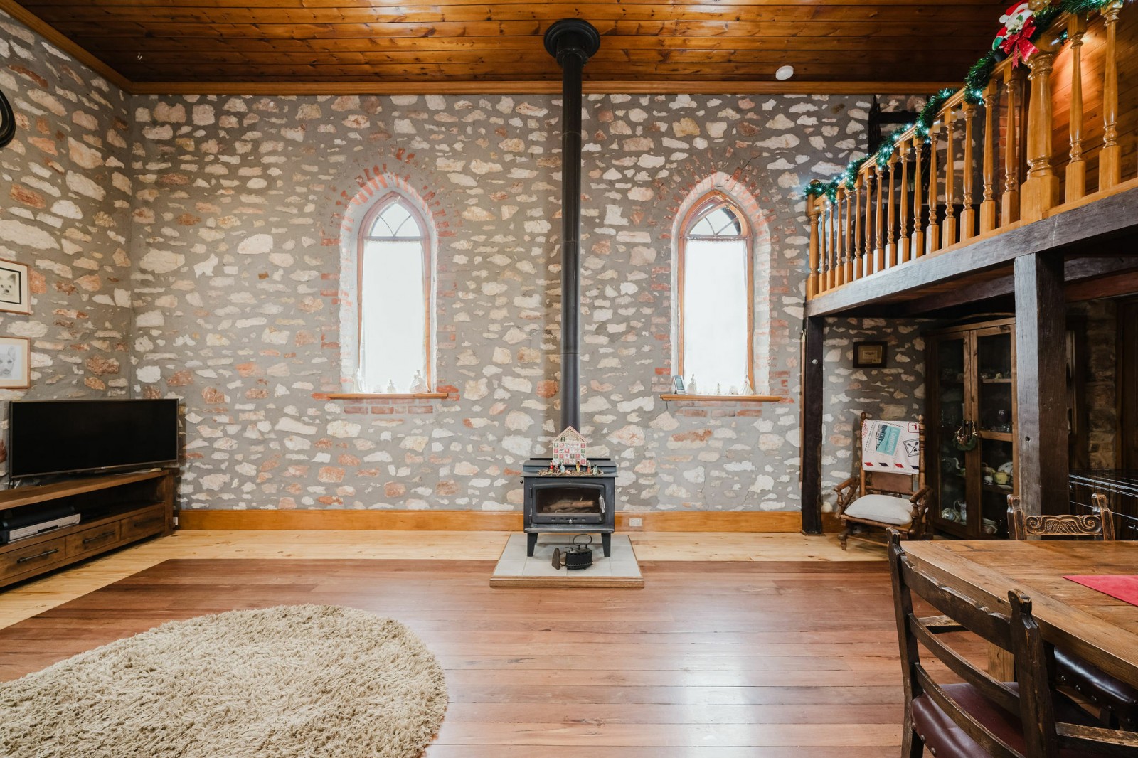 This character stone church is a landmark in the area, with a splendid handcrafted kitchen with slate bench tops and recycled timber. Large living area with leadlight windows, soaring ceilings, stone feature walls, combustion heater, front porch and Baltic pine/slate flooring. Feature woodwork, doors & windows compliment the property. A stunning wooden staircase leads to the beautiful mezzanine floor with two air conditioned bedrooms. Tastefully renovated bathroom with feature stone walls, and dining room with French doors and pergola area with enclosed yard.