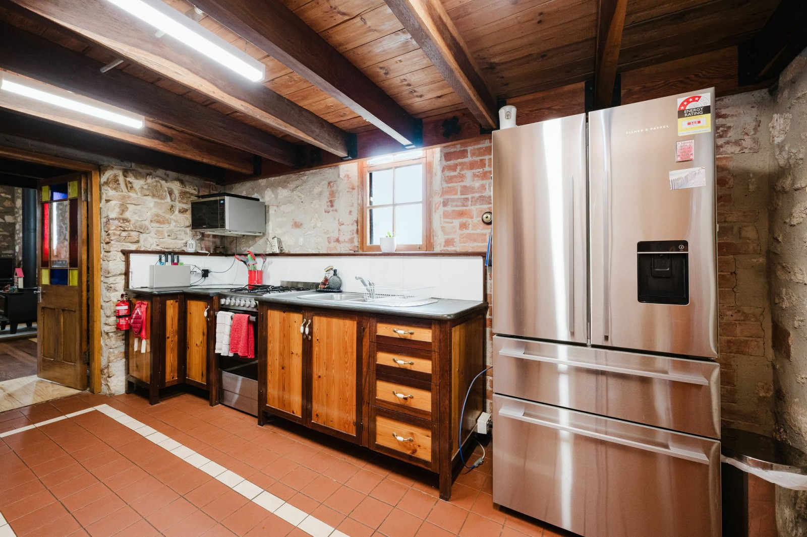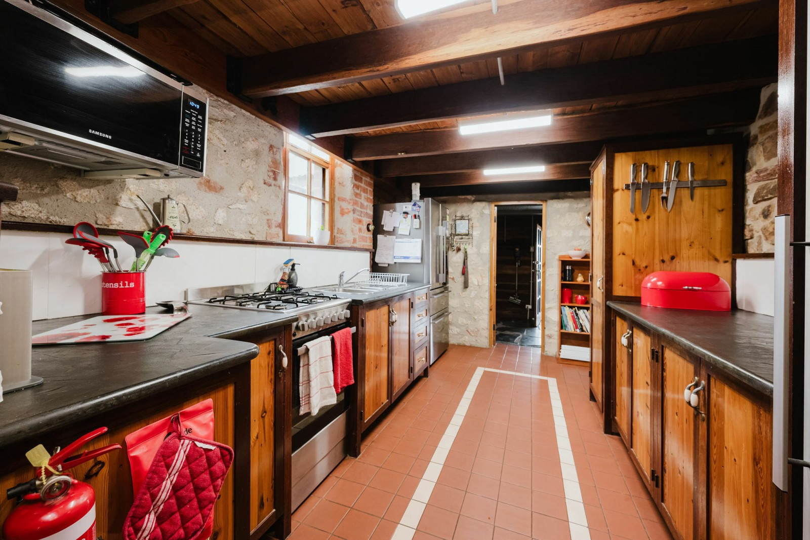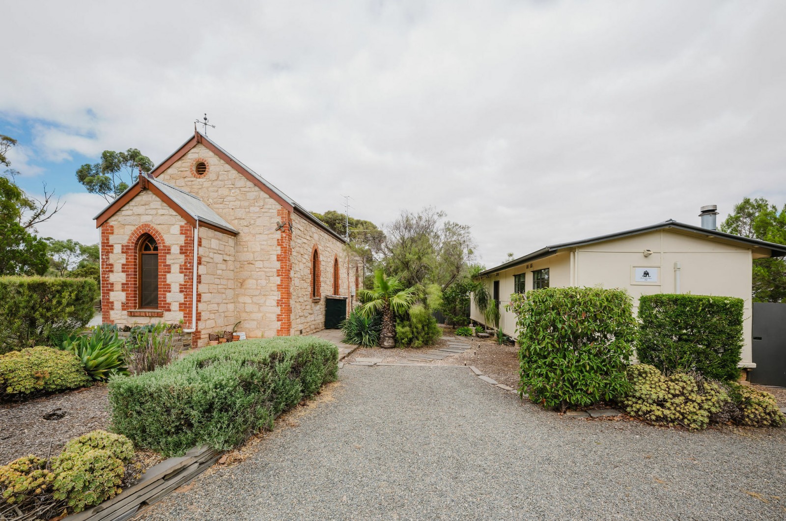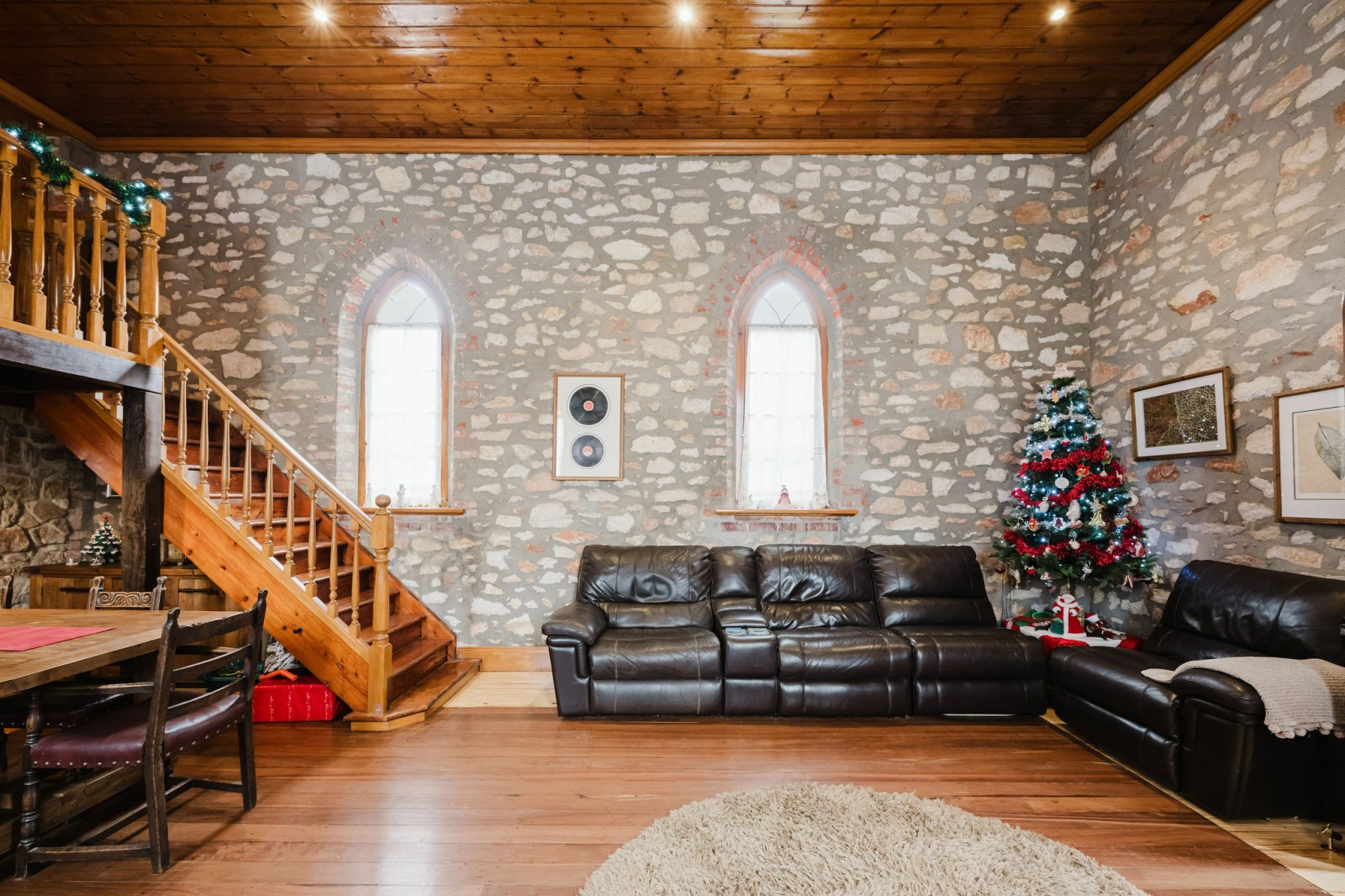 This character stone church is a landmark in the area, with a splendid handcrafted kitchen with slate bench tops and recycled timber. Large living area with leadlight windows, soaring ceilings, stone feature walls, combustion heater, front porch and Baltic pine/slate flooring. Feature woodwork, doors & windows compliment the property. A stunning wooden staircase leads to the beautiful mezzanine floor with two air conditioned bedrooms. Tastefully renovated bathroom with feature stone walls, and dining room with French doors and pergola area with enclosed yard.