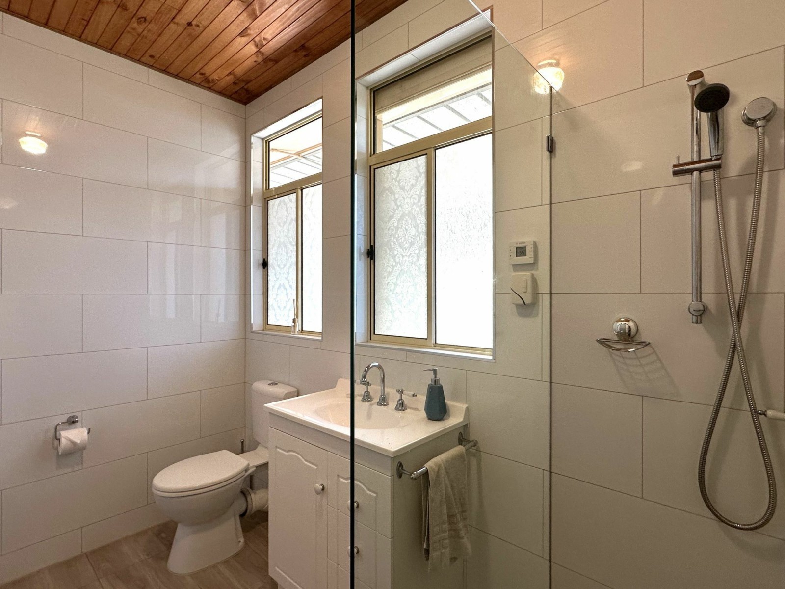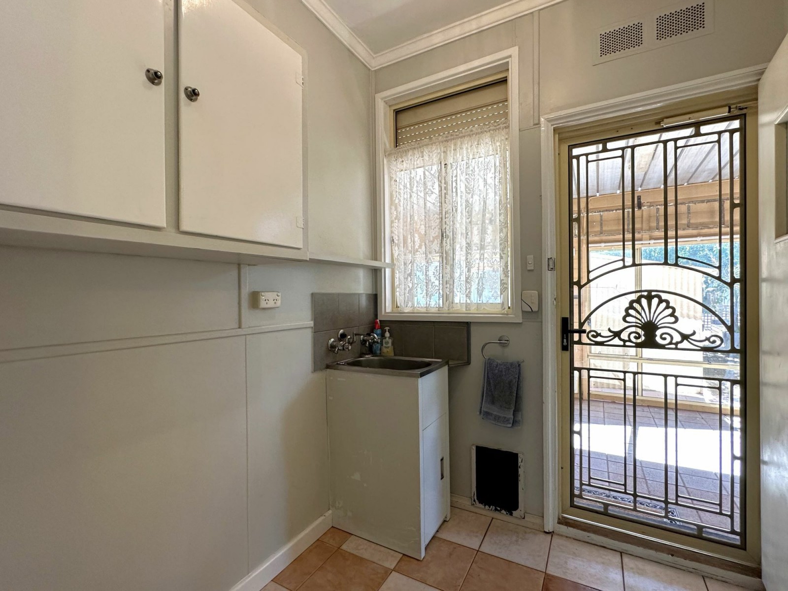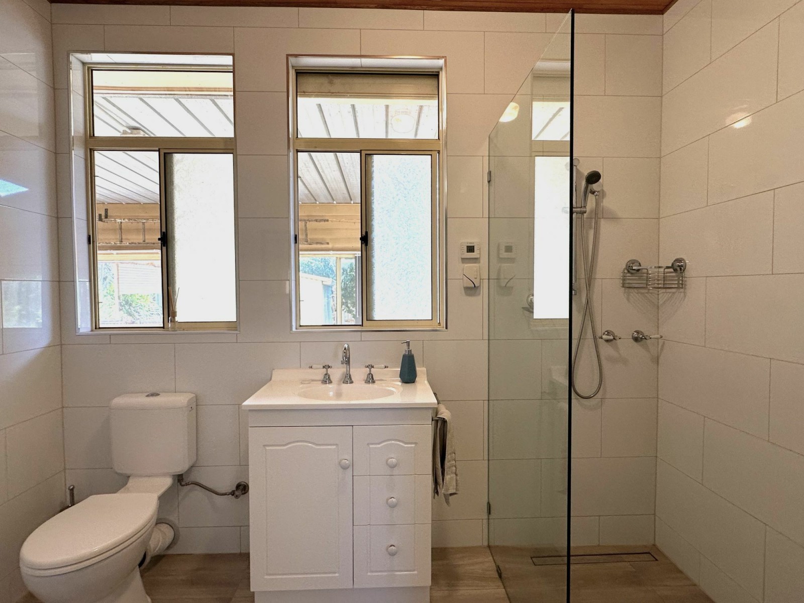 Accommodation is generous, with three well-sized bedrooms all featuring pine floors, ceiling fans and split system air conditioning. The modern bathroom impresses with floor-to-ceiling white tiles, a walk-in shower, sleek white vanity and toilet, while the laundry offers excellent storage and a stainless steel wash trough.