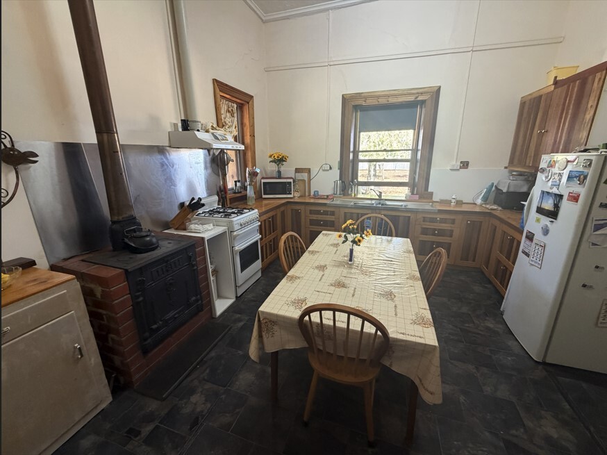 At the heart of the home, the handcrafted timber kitchen is rich in character, offering timber cabinetry and benchtops, a corner pantry, wood-fired oven, gas oven, and a double-bowl sink overlooking the private rear yard.