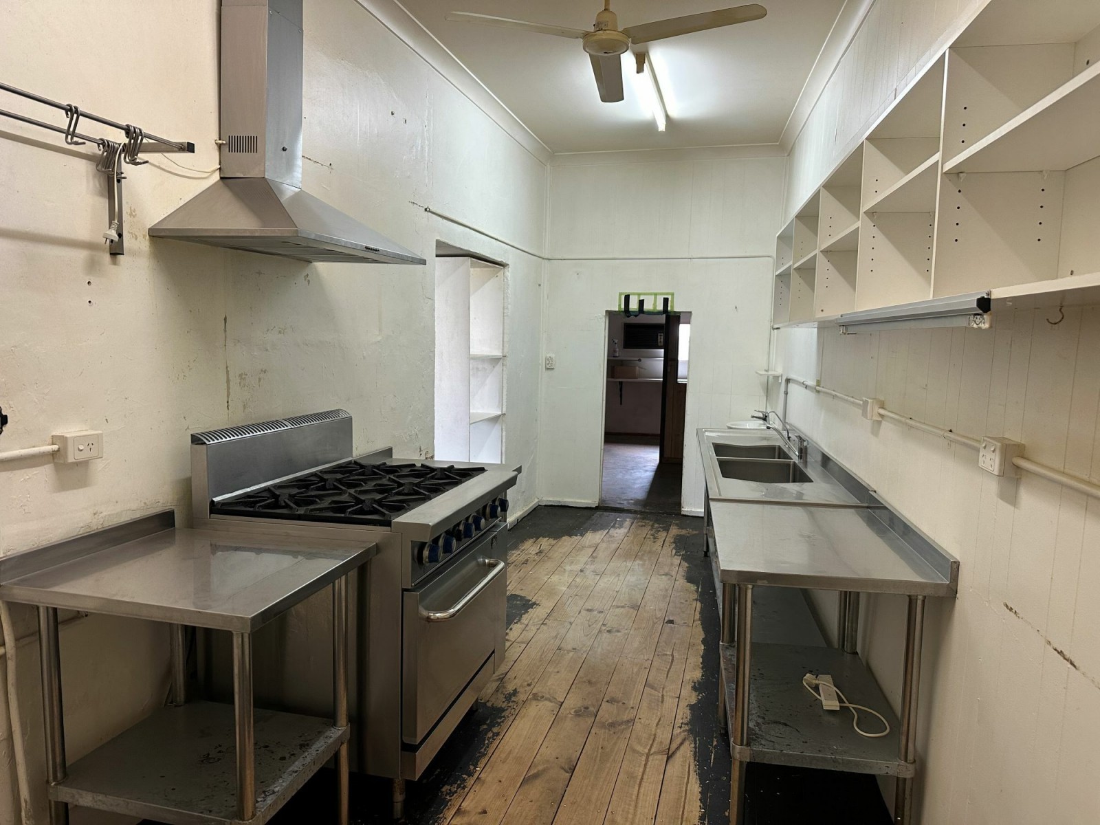 The kitchen space has a timber floor with commercial stainless steel benchs, sink and a commerical freestanding oven/cooktop with rangehood.