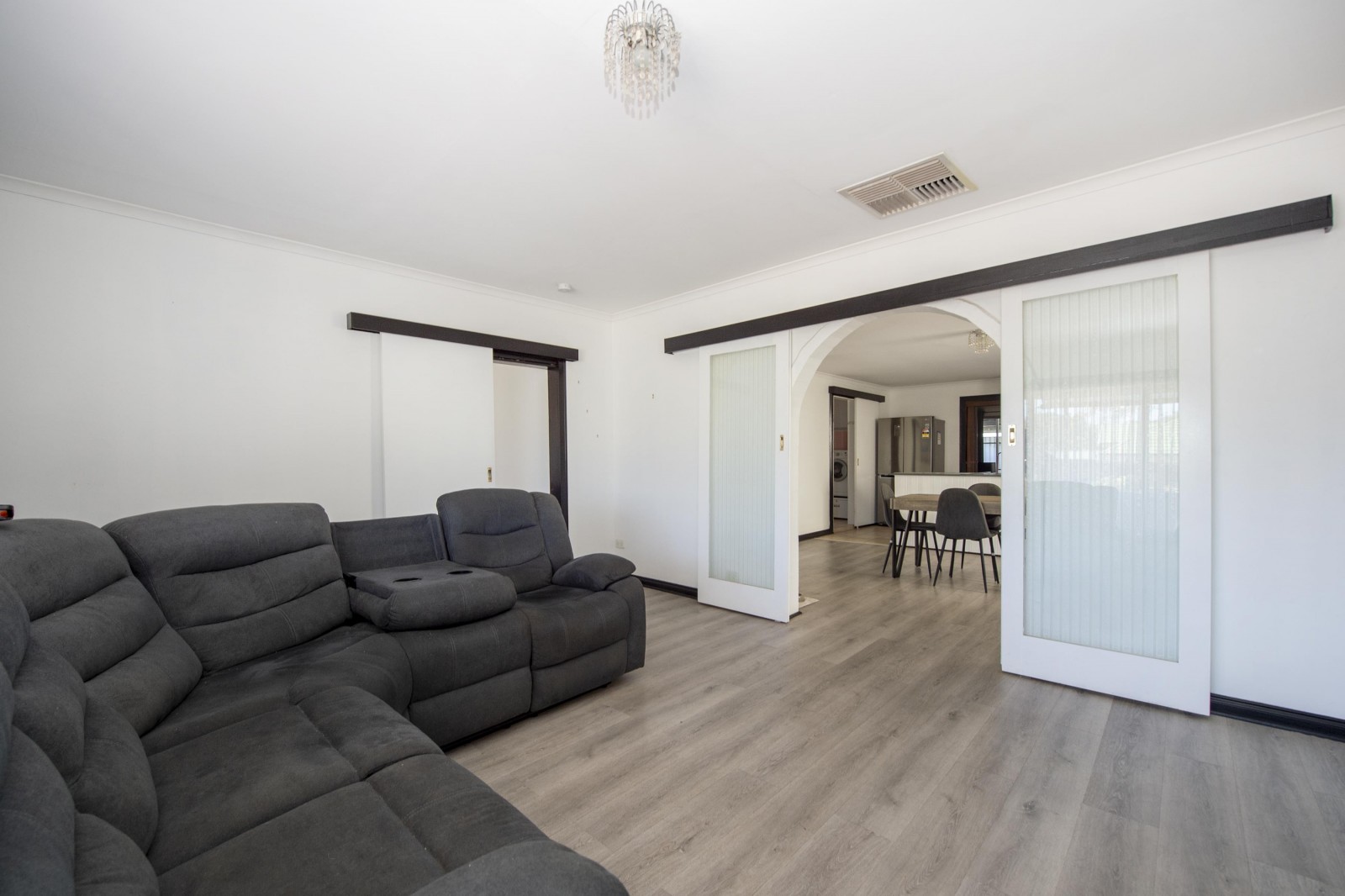 The home opens to a spacious living area that flows seamlessly into the kitchen and dining zone, creating a practical and comfortable central hub. New floating floors run throughout the living and bedroom areas, complemented by fresh paint in contemporary tones and updated window trims for a clean, modern finish.