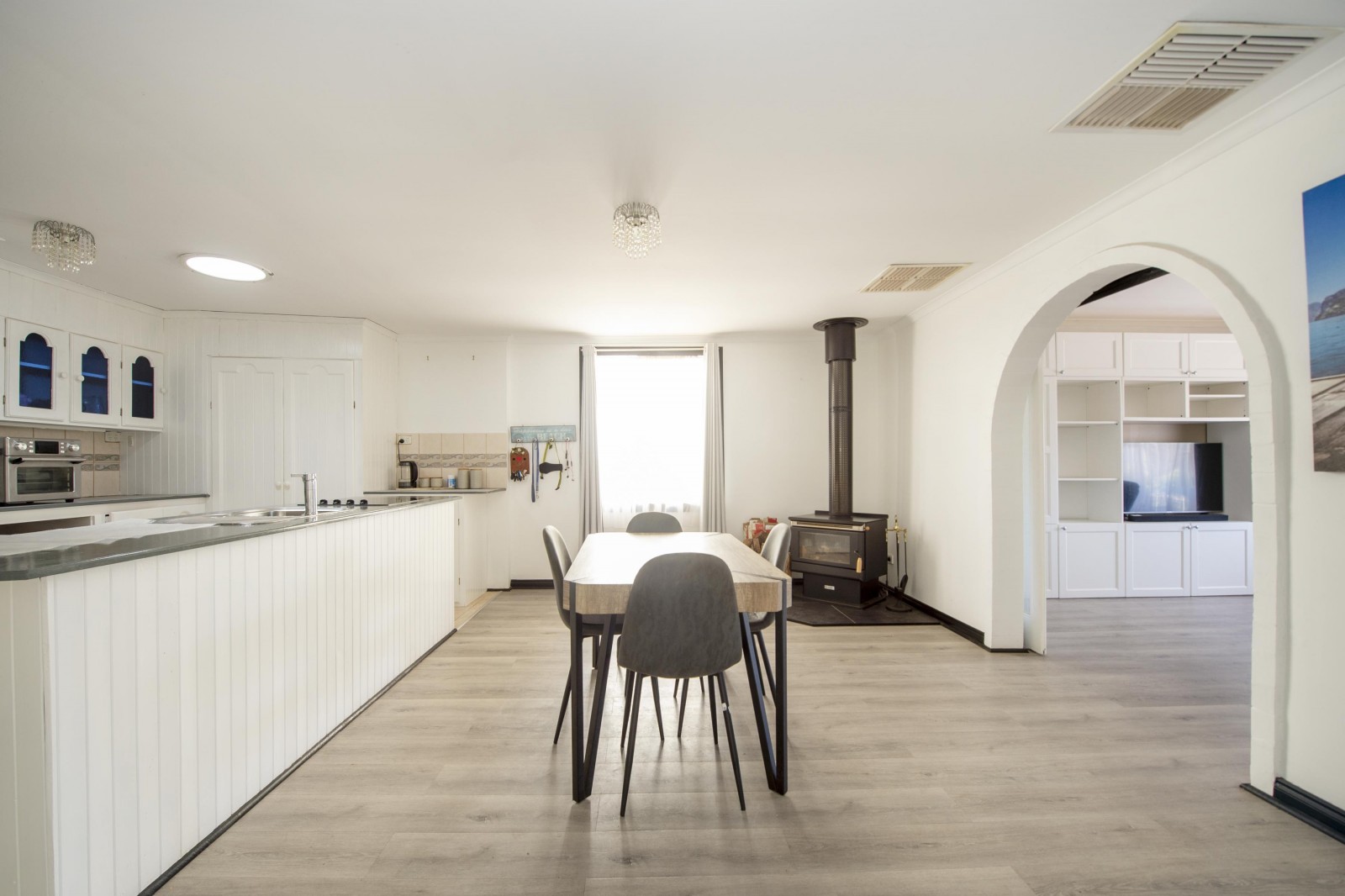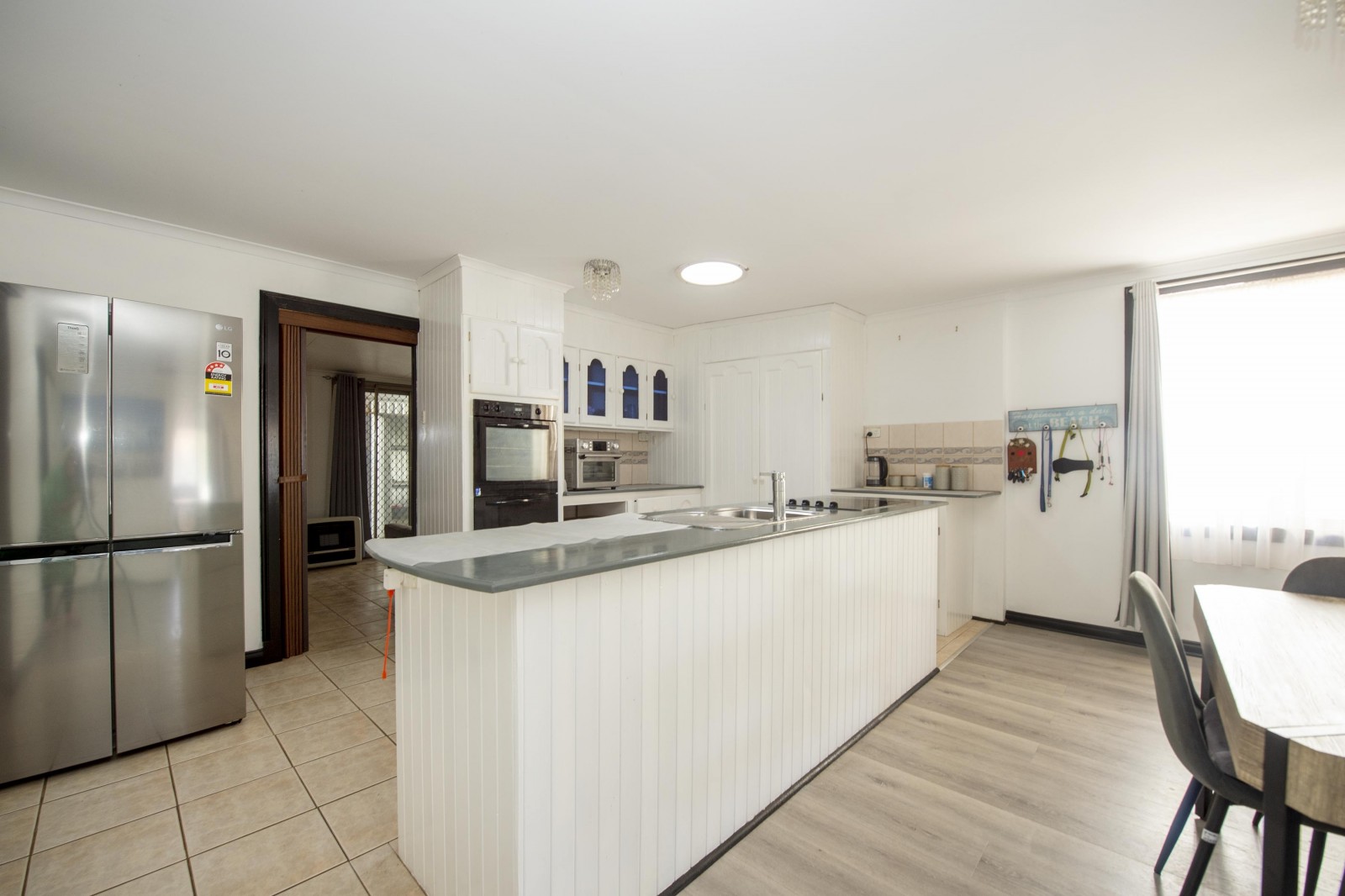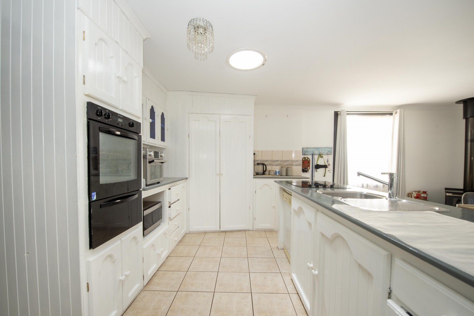 The kitchen provides ample storage and bench space, including overhead cupboards, a corner pantry, electric stove and dishwasher, making everyday living and entertaining easy.