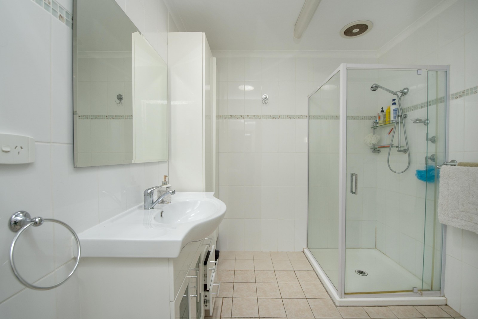 Wet areas are fully tiled and include a stylish bathroom with shower alcove, vanity, toilet and built-in storage, while the laundry is kept separate for added functionality.