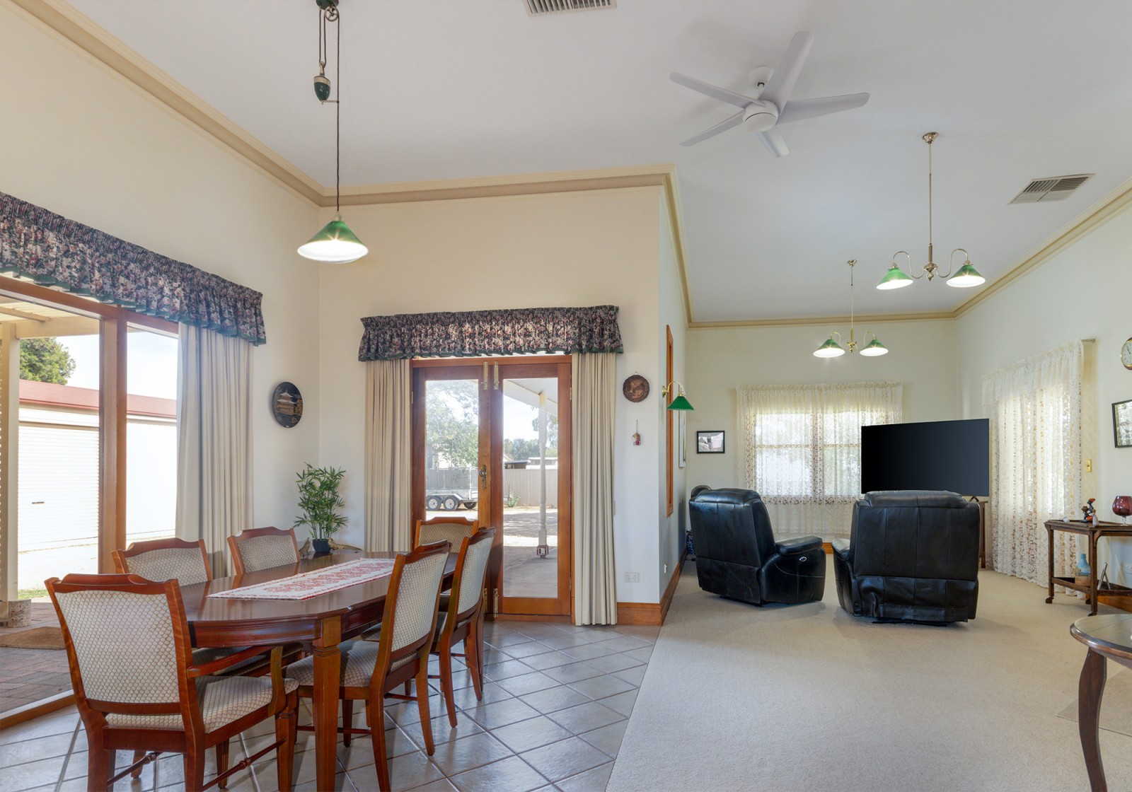 The home offers versatile accommodation with four bedrooms, or three bedrooms plus a dedicated home office. The main bedroom features a built-in robe, while multiple living zones provide excellent separation for families and entertainers alike. A formal dining room/fourth bedroom adds a touch of classic charm, complemented by a generous open plan meals and family area warmed by a slow combustion heater and framed by large glass windows that capture peaceful garden vistas.