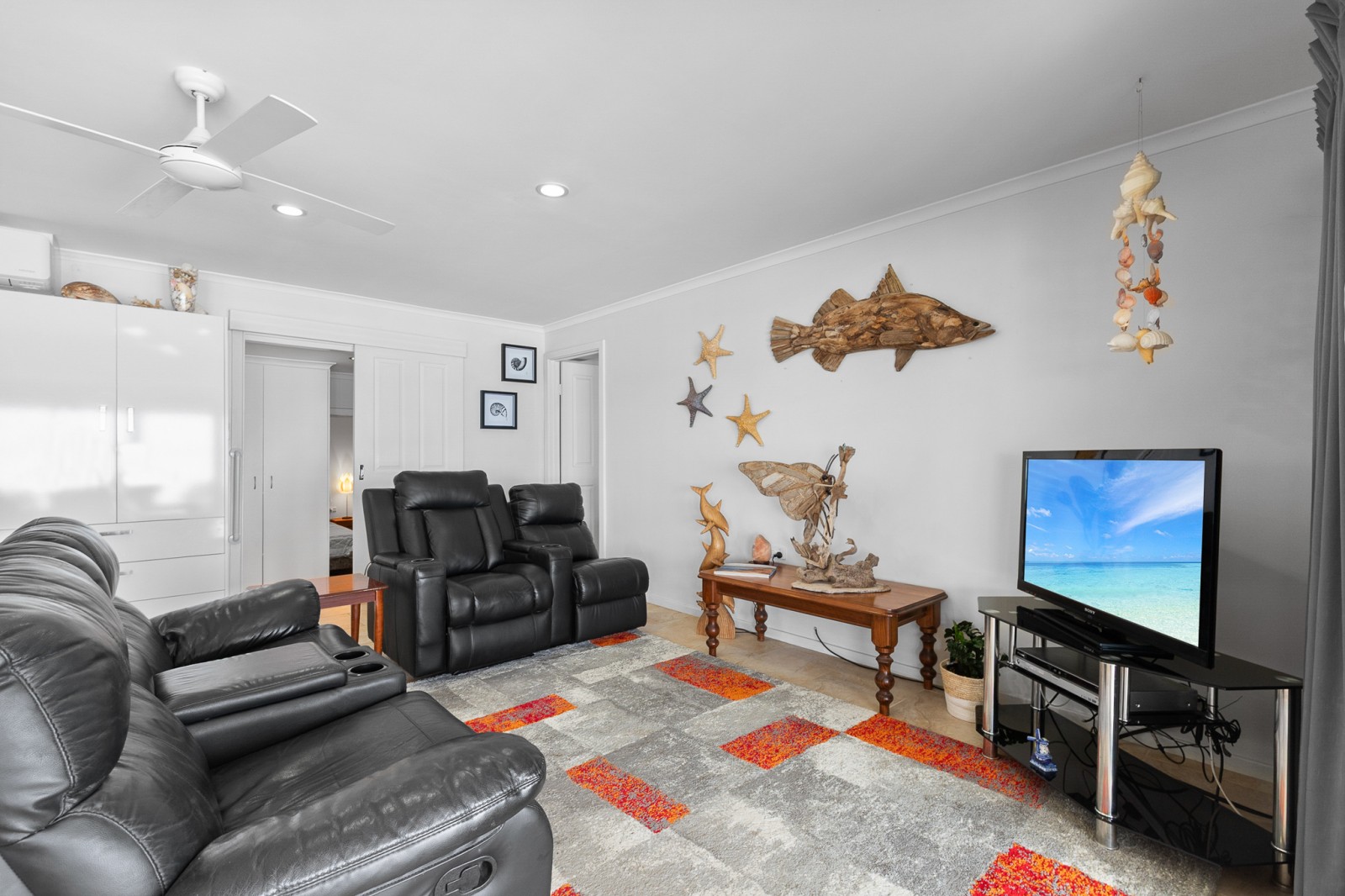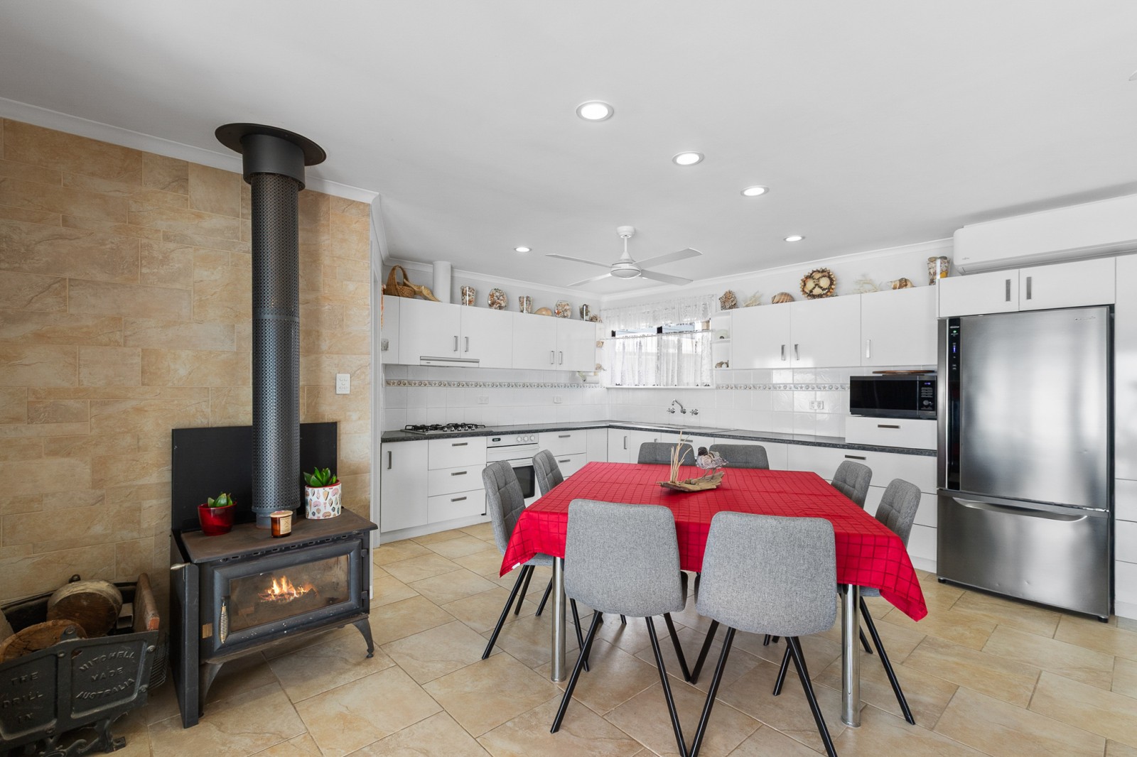 - Open plan living area with ceiling fans, split system and cosy fireplace overlooking the ocean