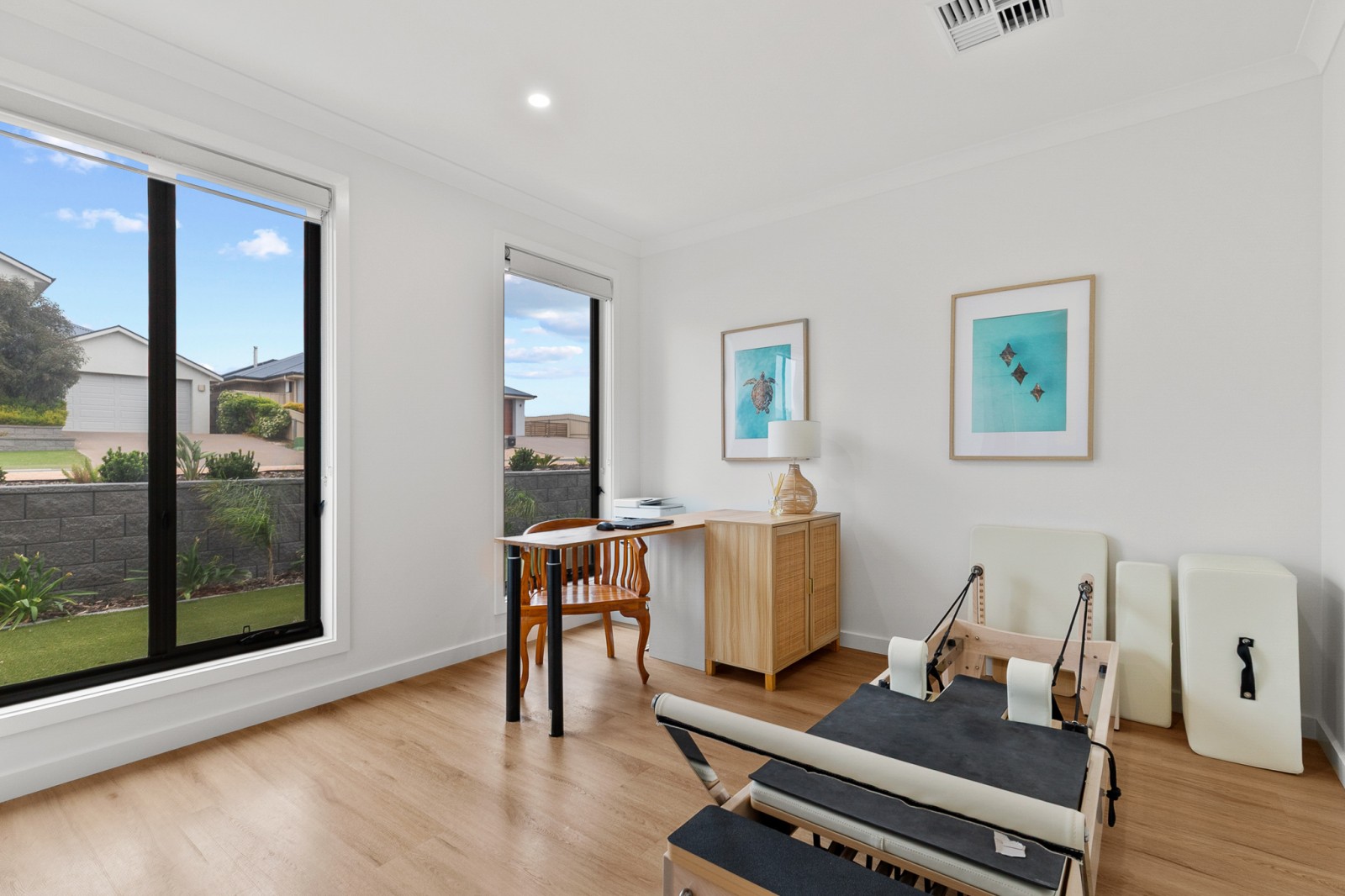 Downstairs provides excellent separation and versatility, offering two spacious bedrooms, a dedicated study, and a games room that seamlessly connects to the outdoor areas, perfect for growing families or guests. Hybrid flooring flows throughout the home, with carpeted bedrooms for added comfort.