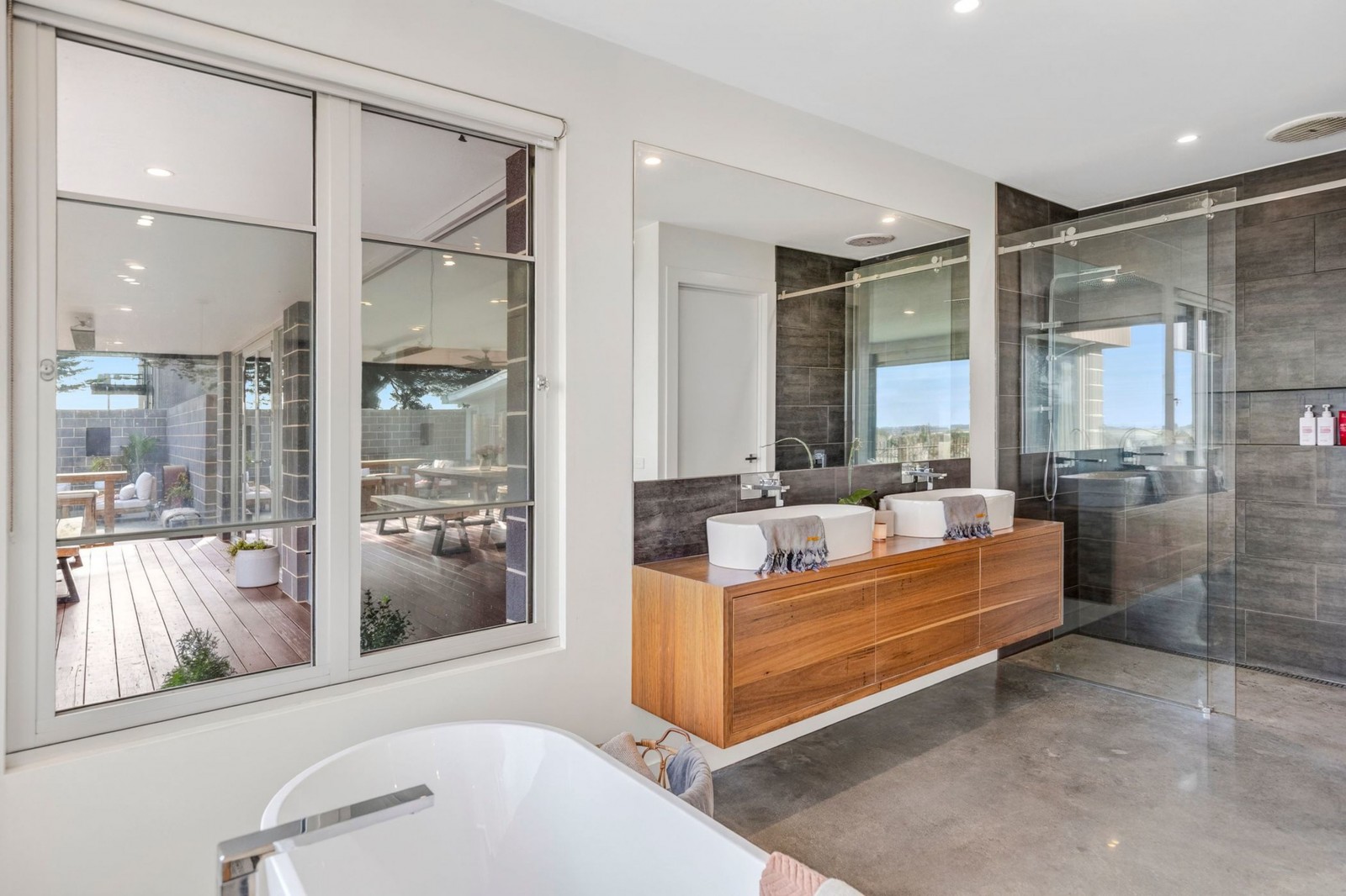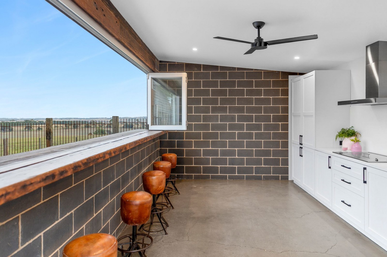 The main suite offers a private retreat, introduced by a recycled timber barn door. With polished concrete floors, large picture windows, and views across the pool and hills, it is a calm and refined space.