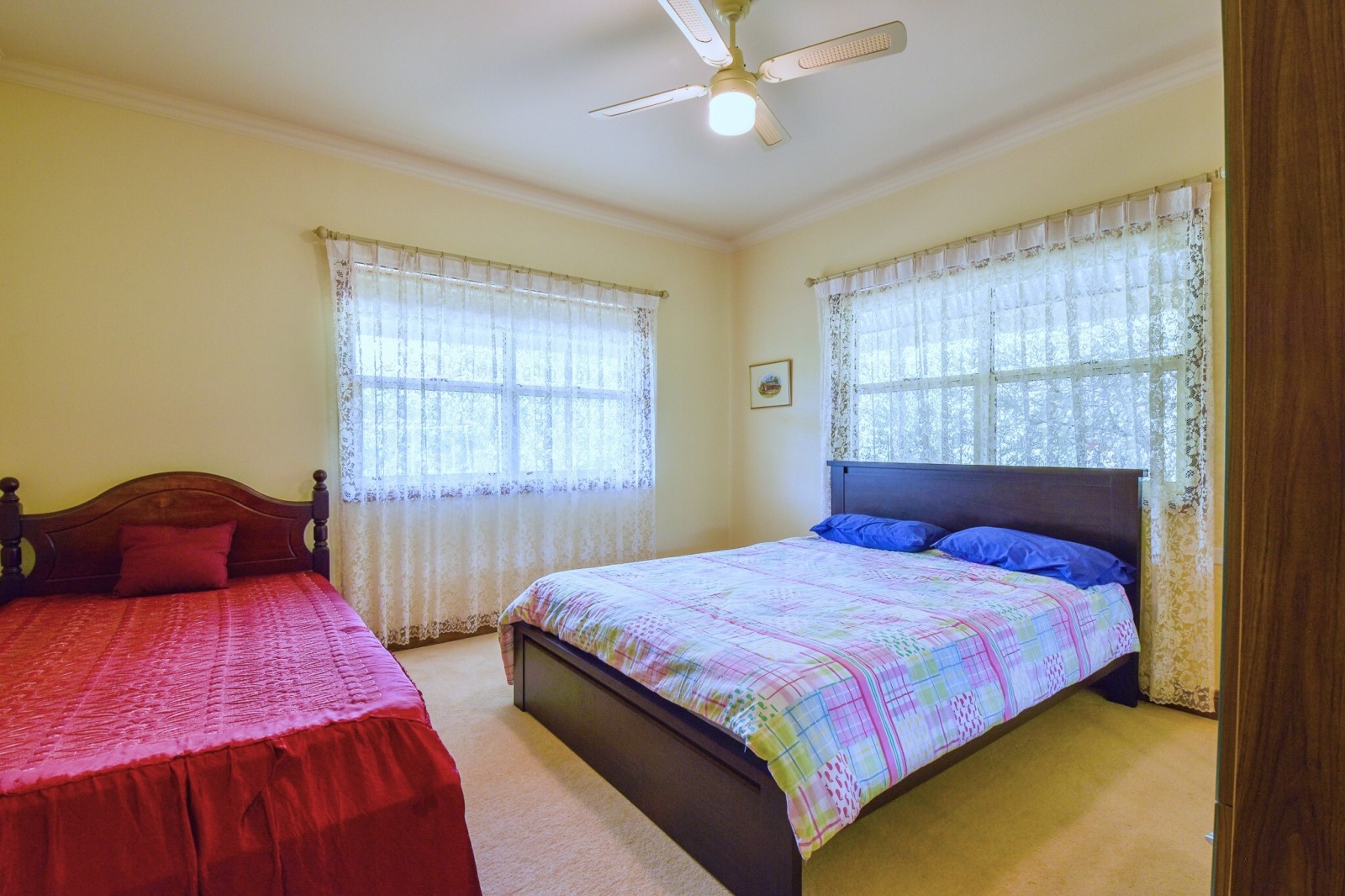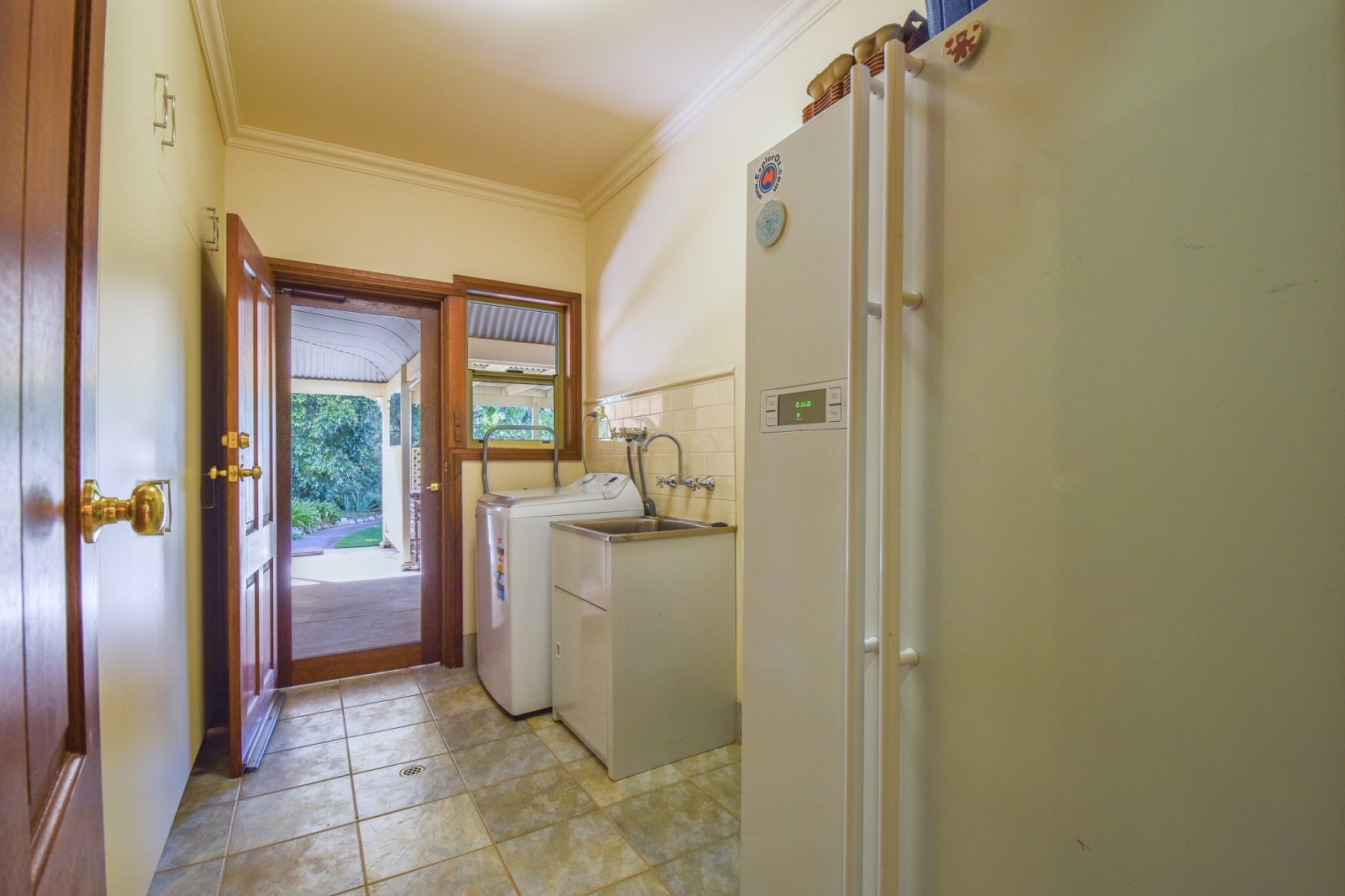 Two additional bedrooms are located toward the rear of the home, both well-sized and fitted with ceiling fans and carpet. The main bathroom services includes a shower, bath, vanity and toilet. Directly across is the laundry with large built in cupboard and stainless steel wash trough.
