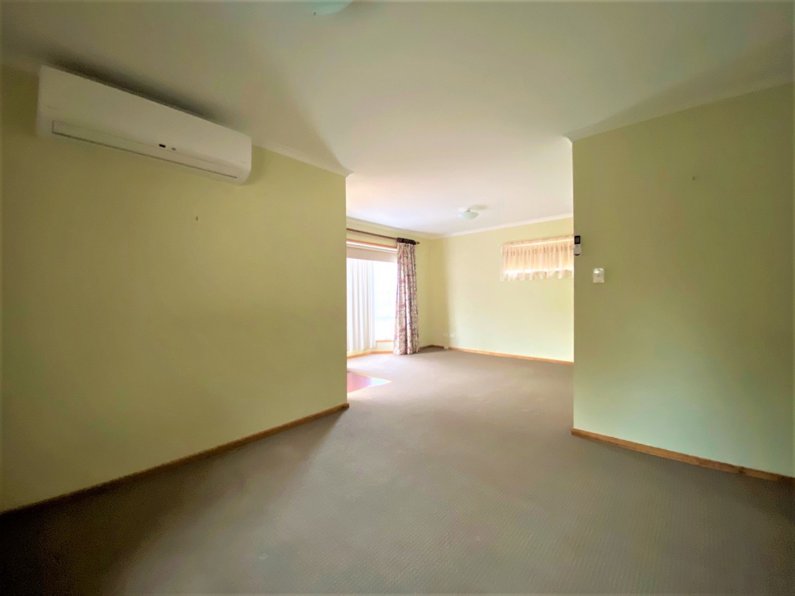 -Open plan lounge and dining room with carpet flooring and reverse-cycle split system air-conditioning