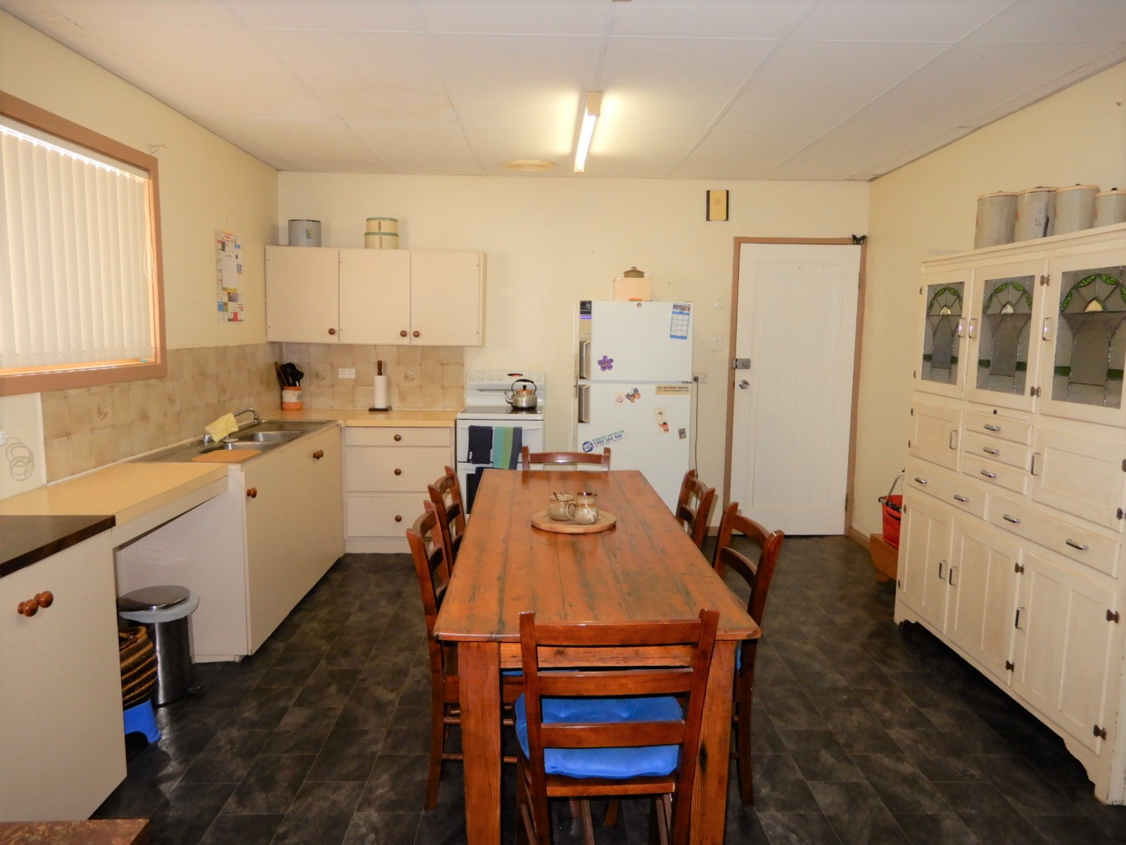 - Large kitchen/dining with electric stove, built in pantry and ample cupboards