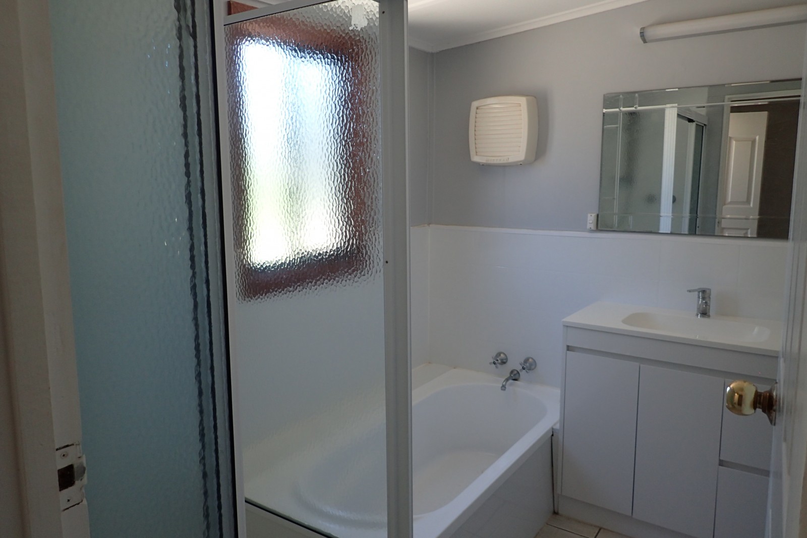 - Bathroom has tiled floor shower, bath and single vanity with separate toilet