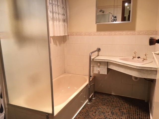- 1 Bathroom with tiled floor and half height wall tiles, shower, bath, corner hand basin and separate toilet
