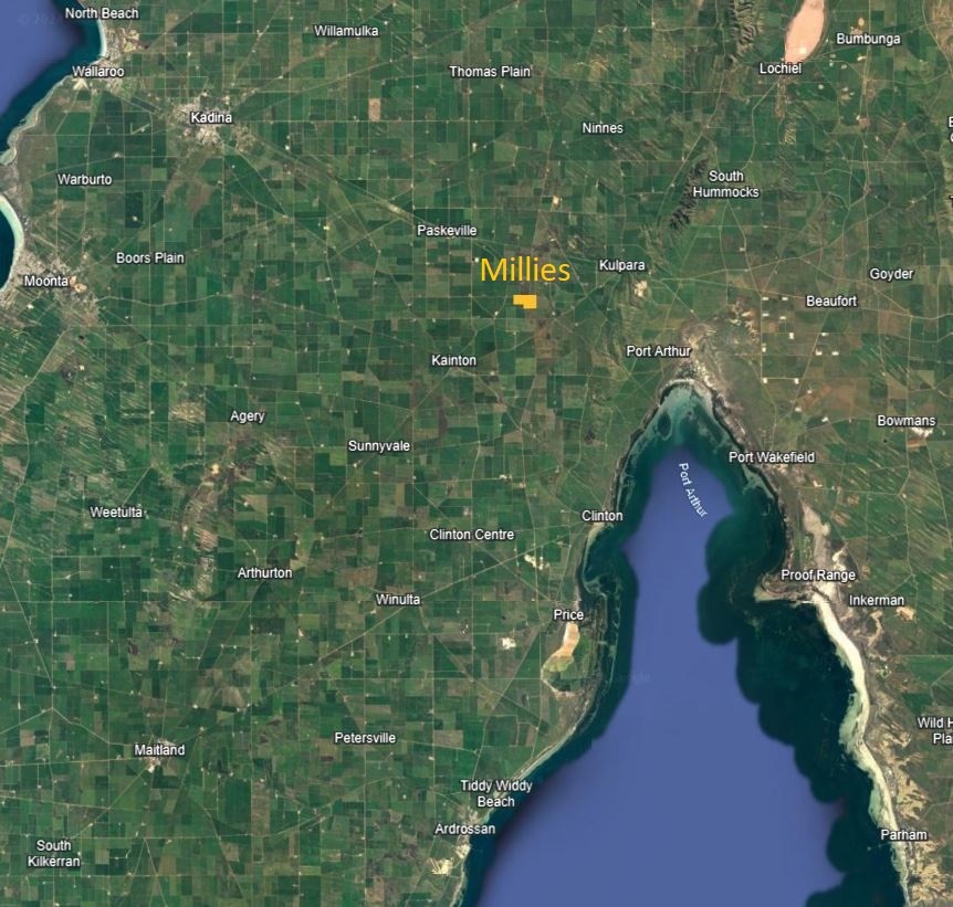 'Millies' is located at the corner of Melton Pontifex Road and G Hills Road, which is 9 km* south-east of Paskeville in the upper Yorke Peninsula. A productive and easy working parcel of land situated 4.5 km* off the Copper Coast Hwy with good access to the major grain terminals at Wallaroo, Ardrossan, Bowmans and Dublin.