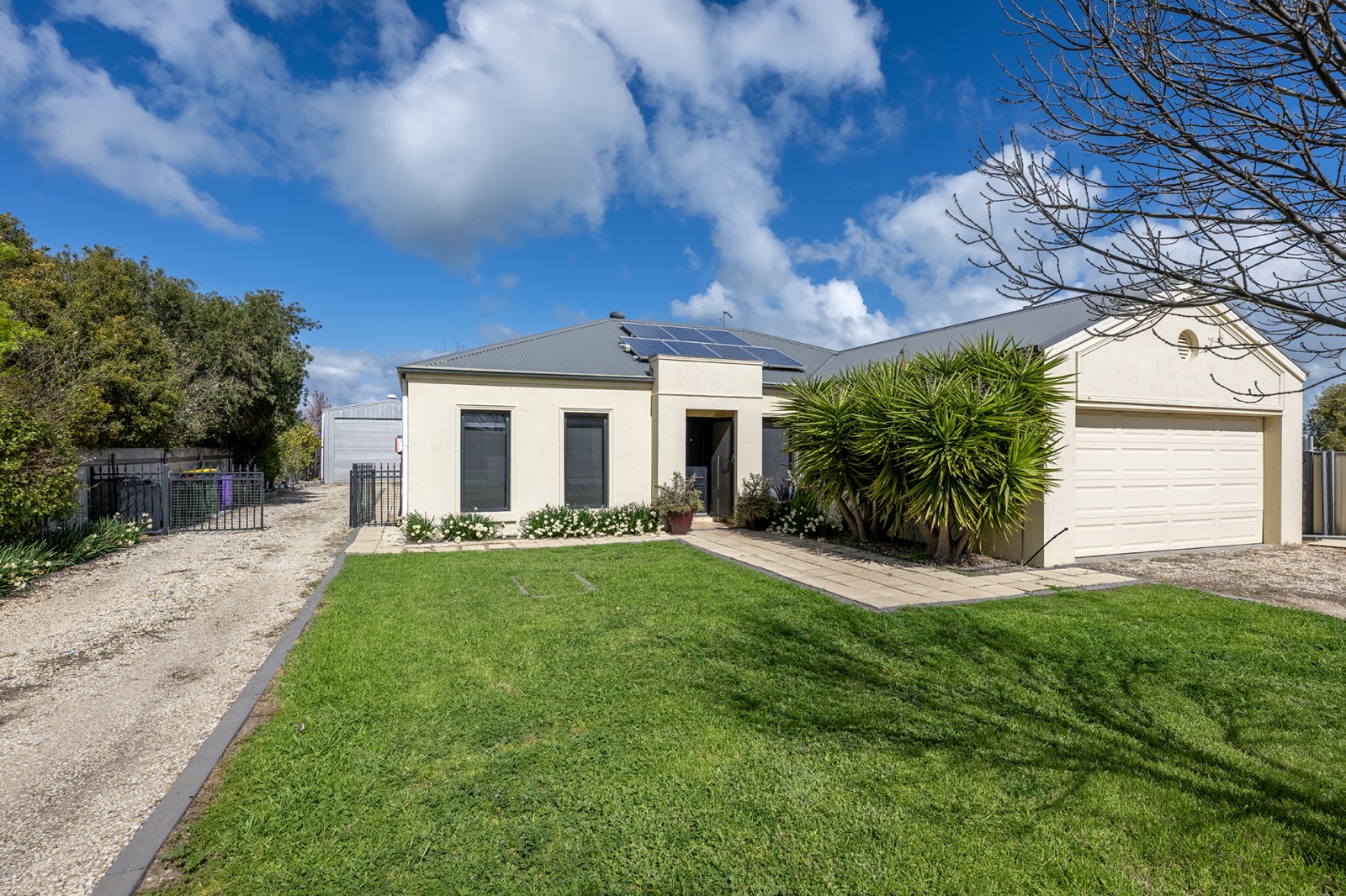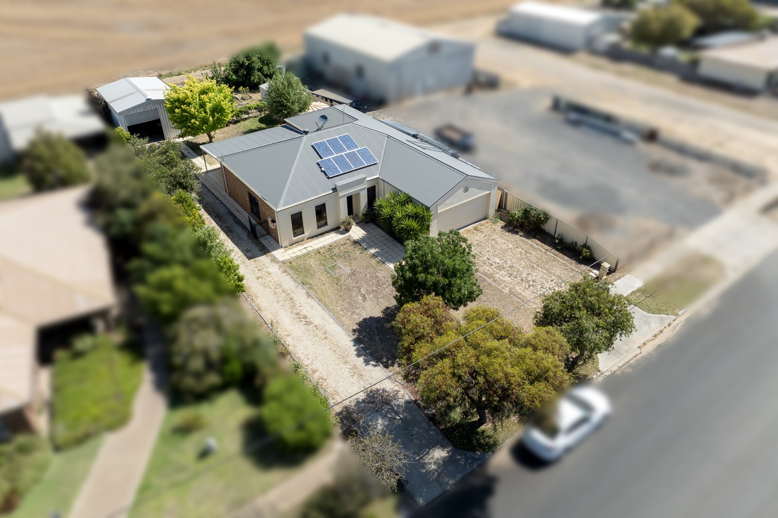 This brick veneer home is ideally located in a popular area of Nhill with a rural outlook at your rear door. With its modern design and spacious layout, this property offers everything you need for comfortable living. Featuring 3 bedrooms, 2 bathrooms this home is perfect for families or retirees looking for both style and functionality. Step inside and be greeted by the open plan living area and study, designed to create a seamless flow throughout the home. The well-appointed kitchen features stainless steel appliances, ample storage, and a breakfast bar, making it the perfect space for cooking and entertaining. The adjacent tiled dining/living area opens onto a covered outdoor patio, providing a great spot for alfresco dining or relaxing with family and friends. The master bedroom with glass sliding door to outside plus an ensuite bathroom and a walk-in wardrobe. The two additional bedrooms are generously sized with BIR's and share a modern family bathroom offering, bath and shower. The garage and shed provides ample space for parking and storage, ensuring convenience for the whole family.