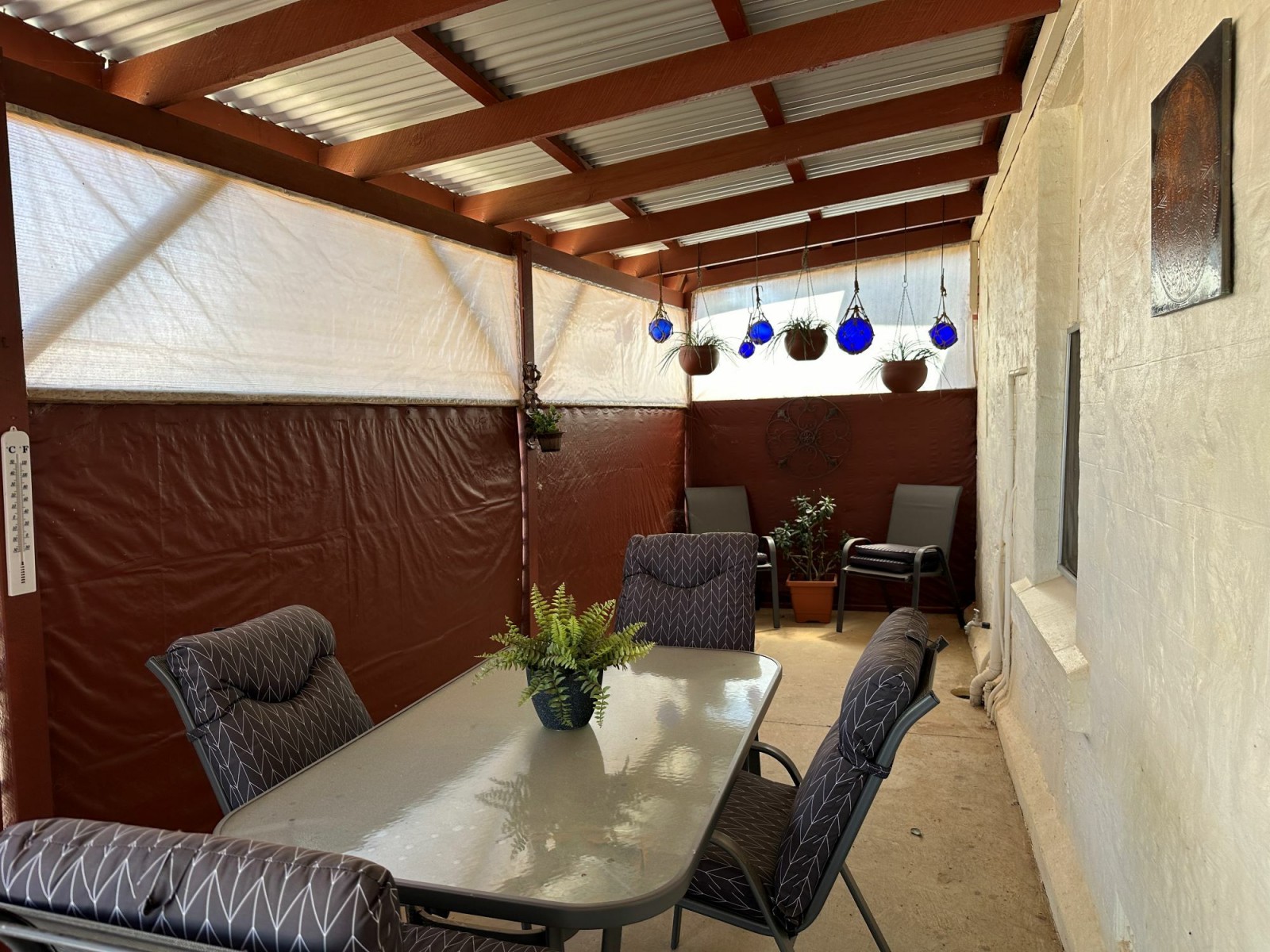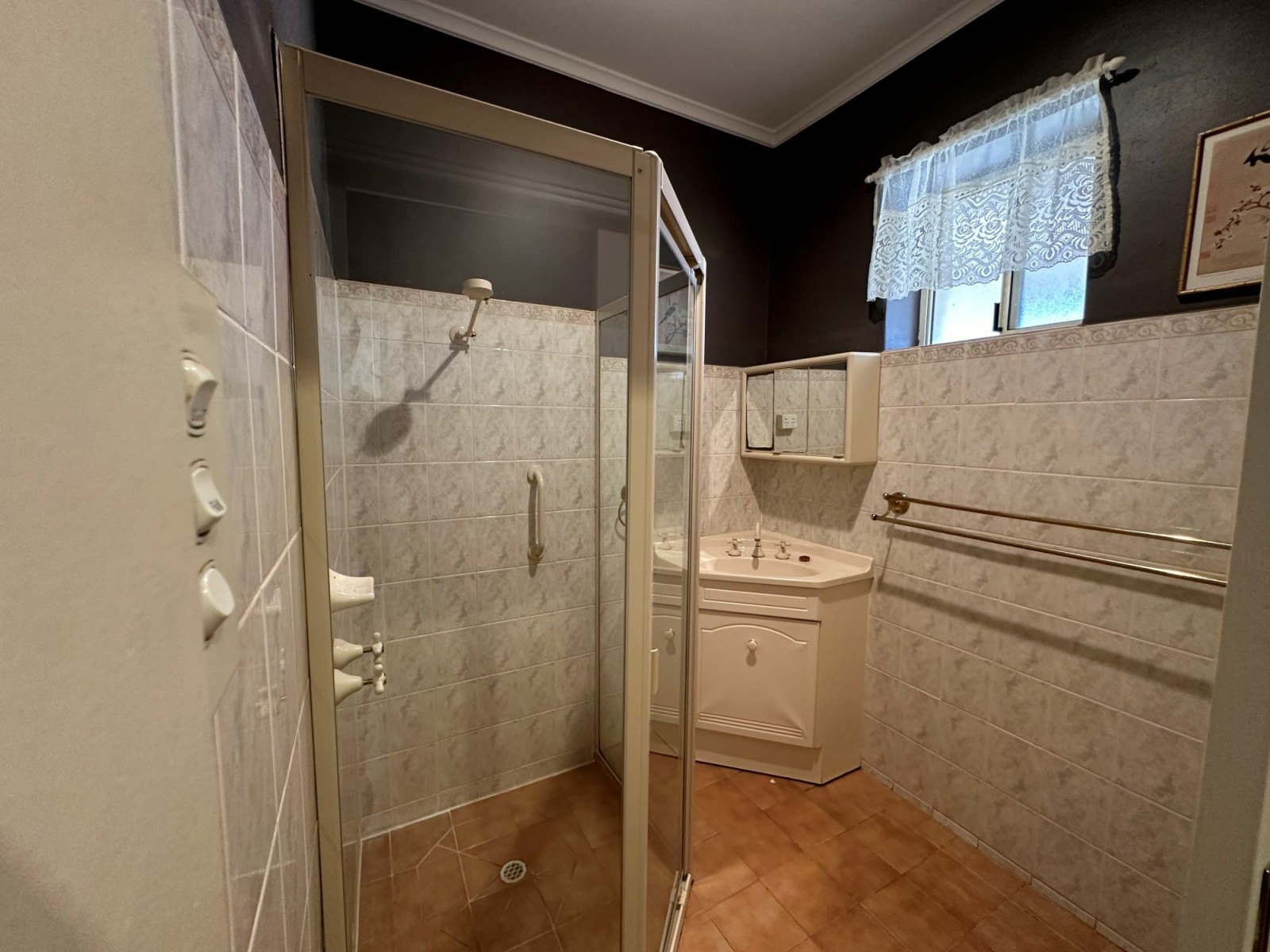 Step inside to a central hallway, ensuring excellent flow between rooms. The neat country kitchen, featuring a freestanding electric oven and rangehood, is ready for home-cooked meals. The bathroom includes a corner vanity, large corner shower, and a separate toilet for added convenience.