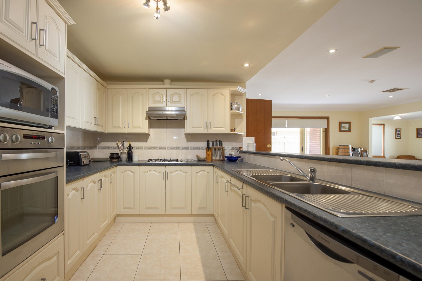 At the heart of the home, the well-appointed kitchen overlooks the open-plan family area and is equipped with premium stainless steel appliances. Sliding doors open to the alfresco area, creating a seamless indoor-outdoor flow.