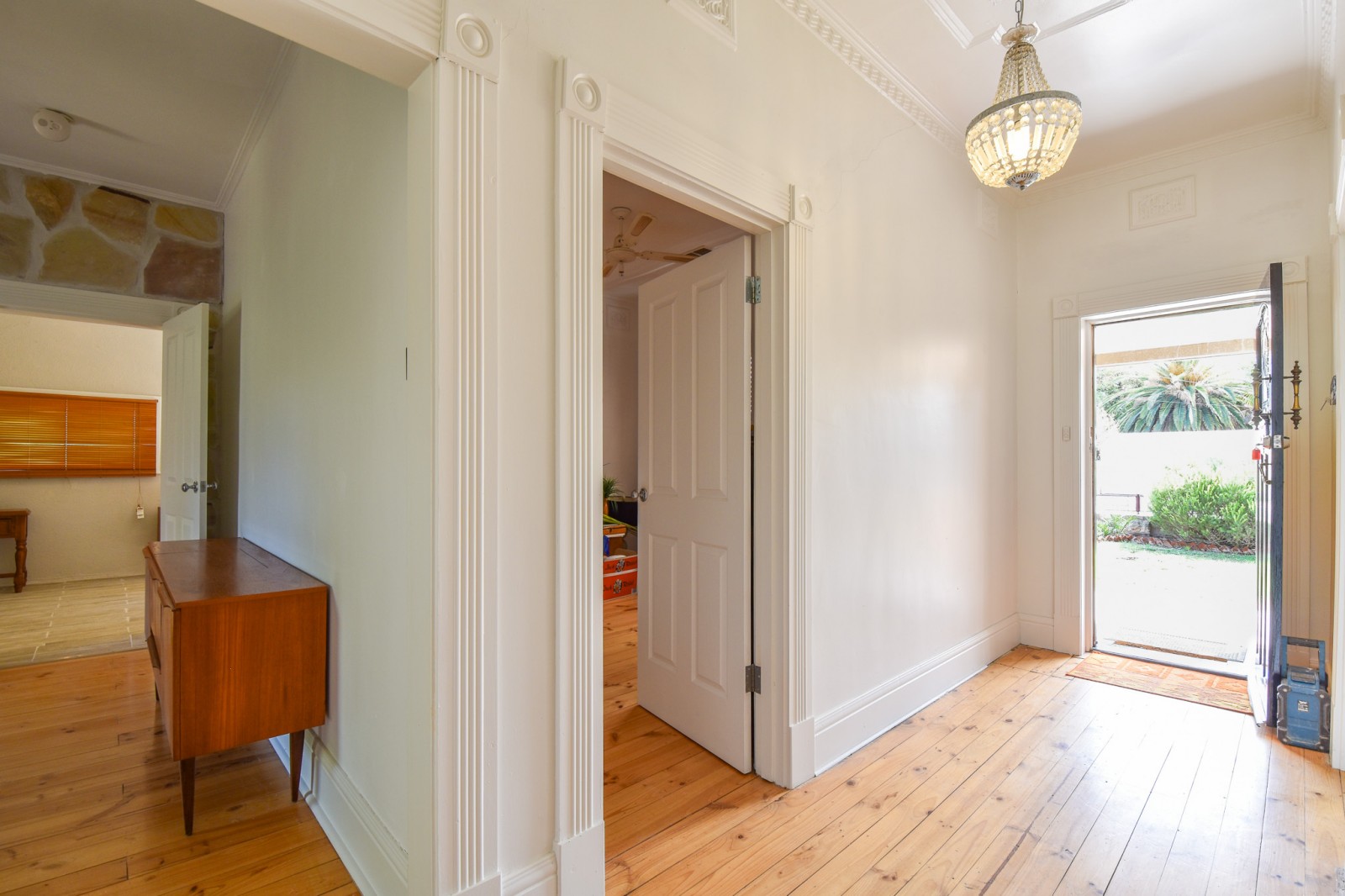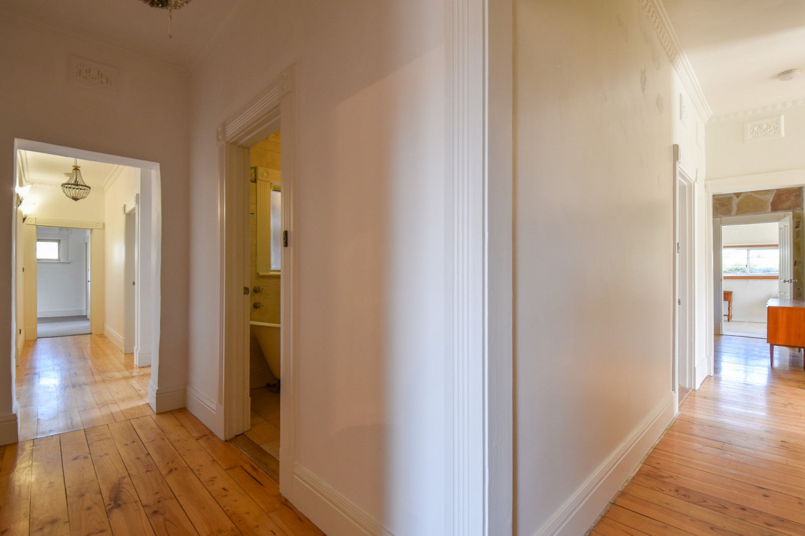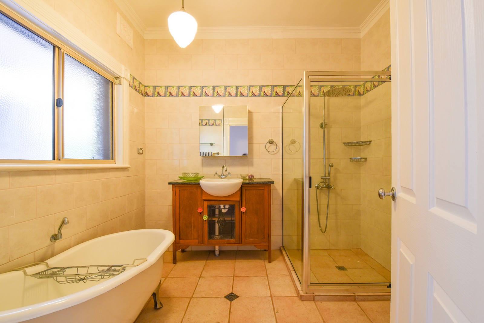 The main bathroom is centrally located with floor-to-ceiling tiles, a single basin vanity, mirrored shaving cabinet, shower, toilet, and charming claw foot tub. A functional laundry with built-in storage, a stainless steel wash trough, and rear access completes the interior.