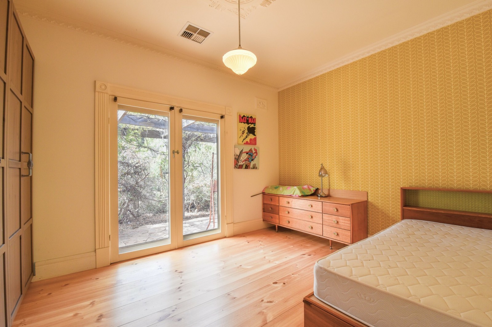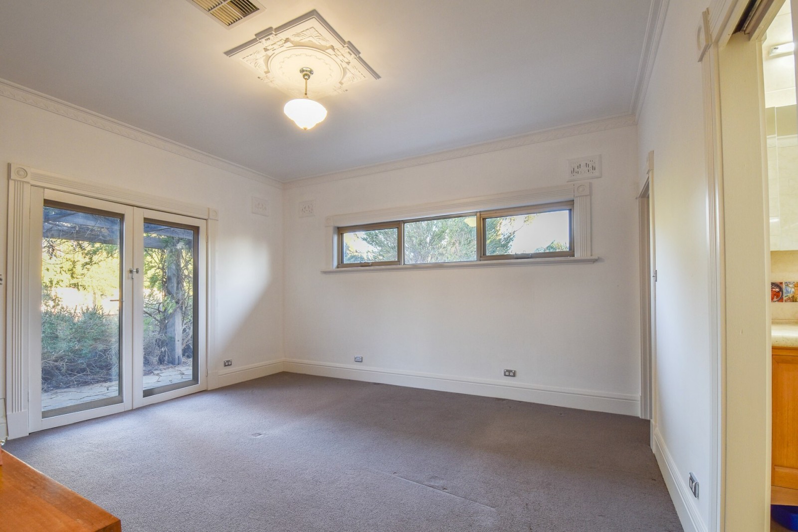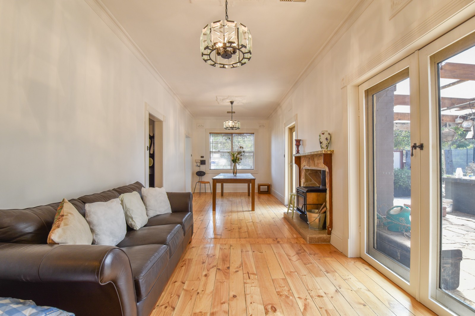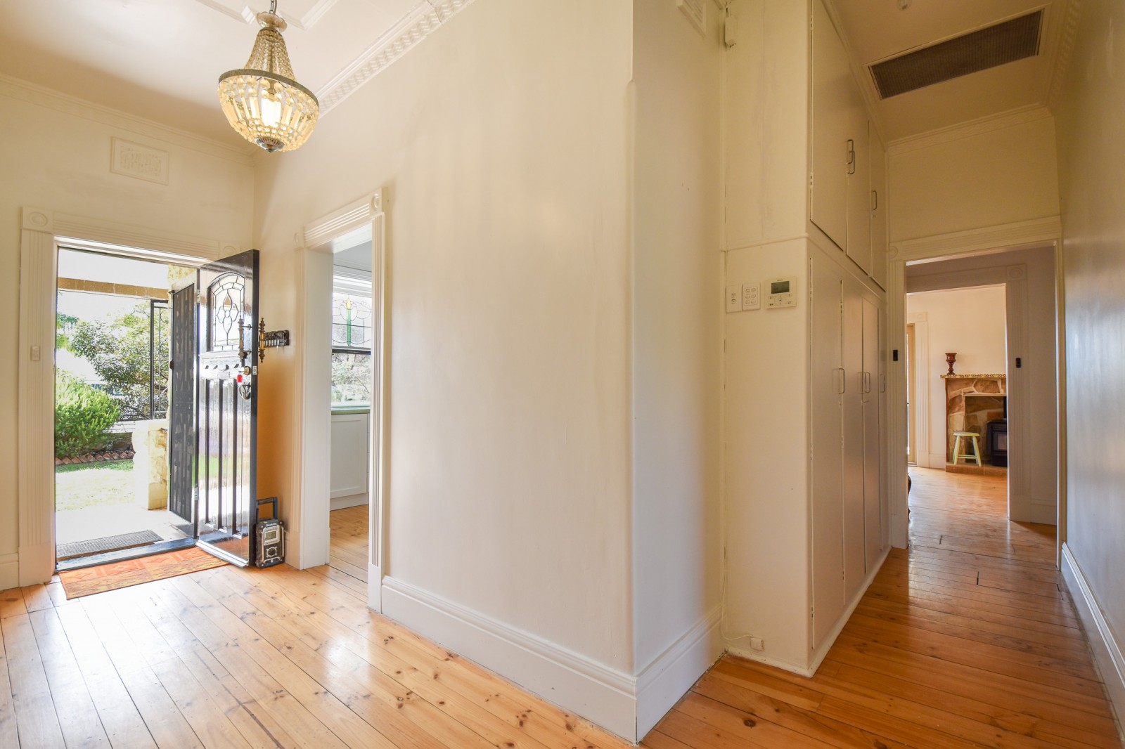 The main bathroom is centrally located with floor-to-ceiling tiles, a single basin vanity, mirrored shaving cabinet, shower, toilet, and charming claw foot tub. A functional laundry with built-in storage, a stainless steel wash trough, and rear access completes the interior.