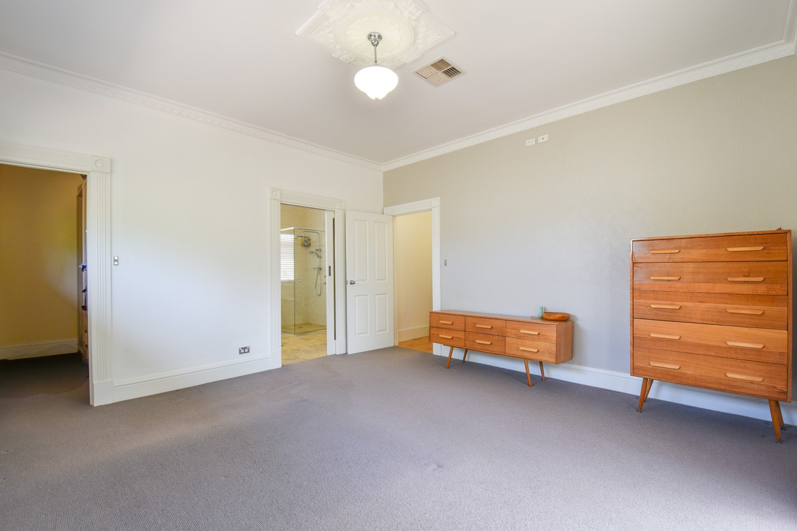 The spacious master bedroom is a true sanctuary, featuring French doors that open to the backyard, a walk-in wardrobe, and generous ensuite allowing for wheelchair access . The ensuite is elegantly appointed with neutral floor-to-ceiling tiles, a double basin vanity, a mirrored shaving cabinet, shower, bath, and toilet.