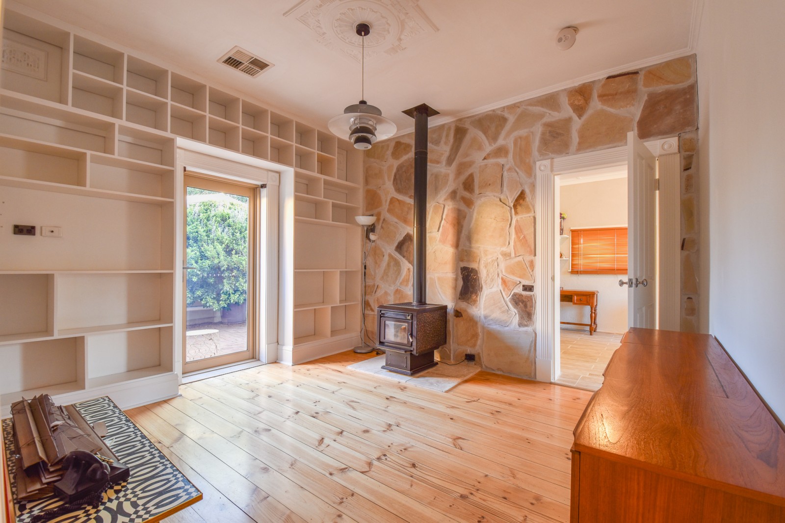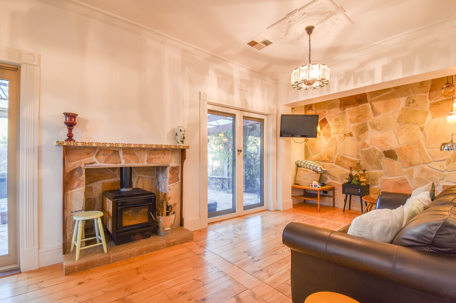 A second living area provides further retreat, showcasing another stunning sandstone feature wall, a slow combustion wood fire, and a large bookcase – perfect for relaxation and unwinding.